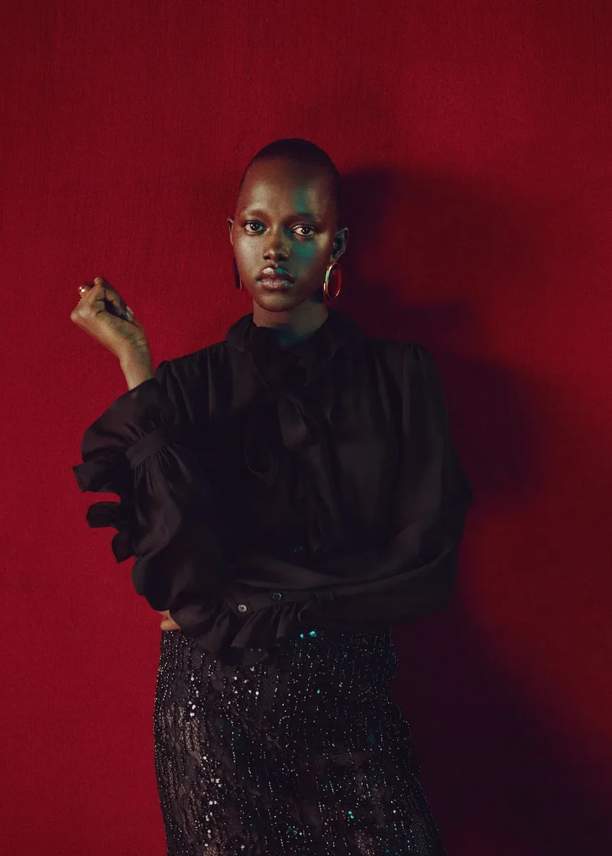 Tento model s rovným střihem a volánky má kulatý výstřih zdobený šátkem. Dlouhé rukávy mají manžety na knoflíky a přední zapínání je doplněno knoflíky.