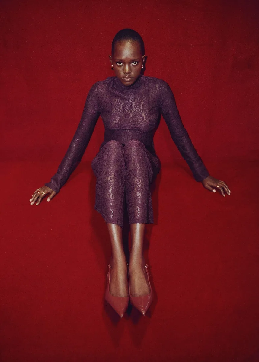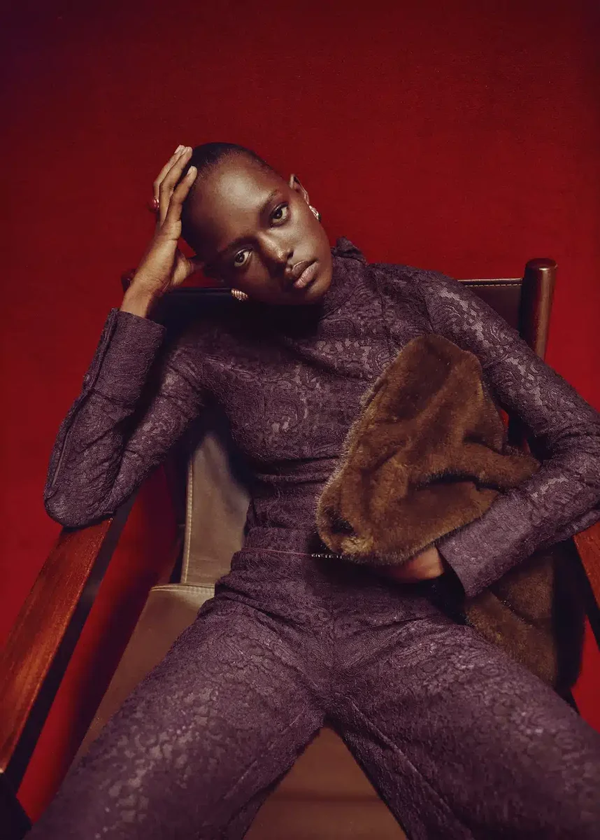 Tento oděv je vyroben z krajkové látky a má rovný střih s vysokým límcem zdobeným šátkem. Dlouhé rukávy mají manžety na knoflíky a zadní část se pyšní elegantním výstřihem. Součástí je i ladící kalhoty.