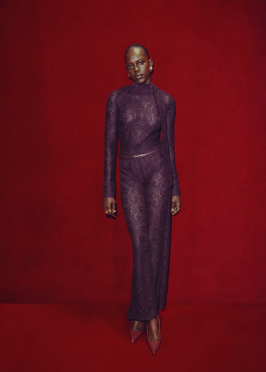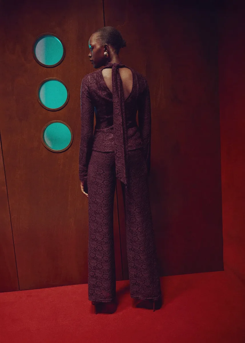 Tento oděv je vyroben z krajkové látky a má rovný střih s vysokým límcem zdobeným šátkem. Dlouhé rukávy mají manžety na knoflíky a zadní část se pyšní elegantním výstřihem. Součástí je i kalhoty ve stejném stylu.