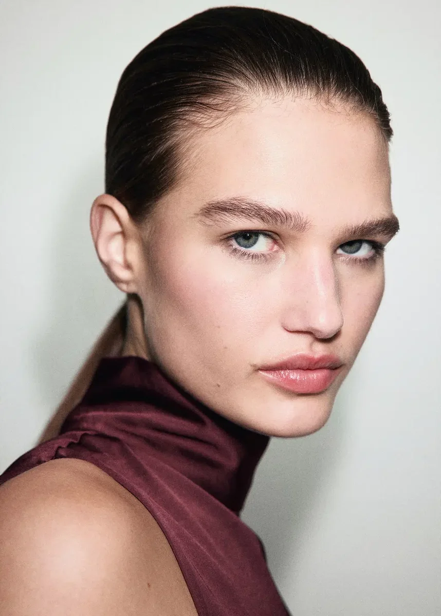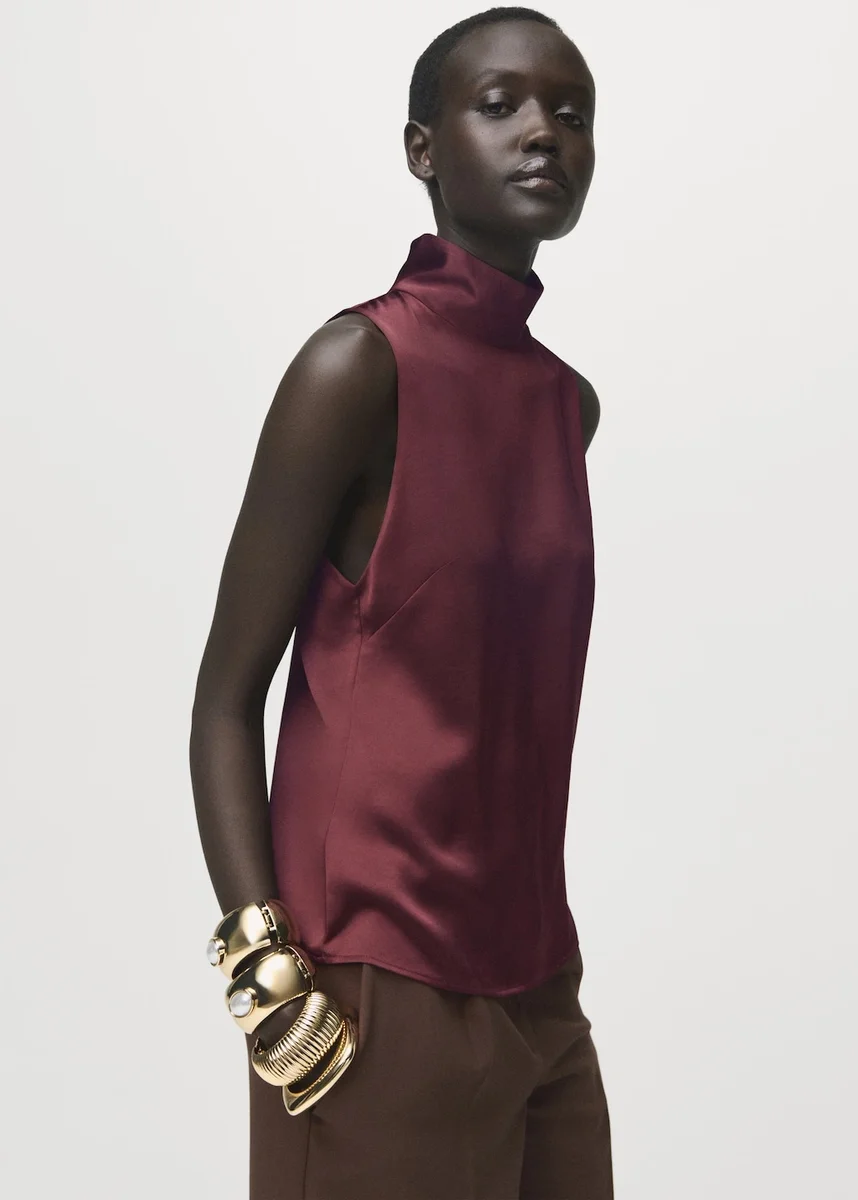 Tento model ze saténové tkaniny má rovný střih s vysokým výstřihem a bez rukávů. Zapínání na zip na zadní straně usnadňuje oblékání. K dispozici v nadměrných velikostech.