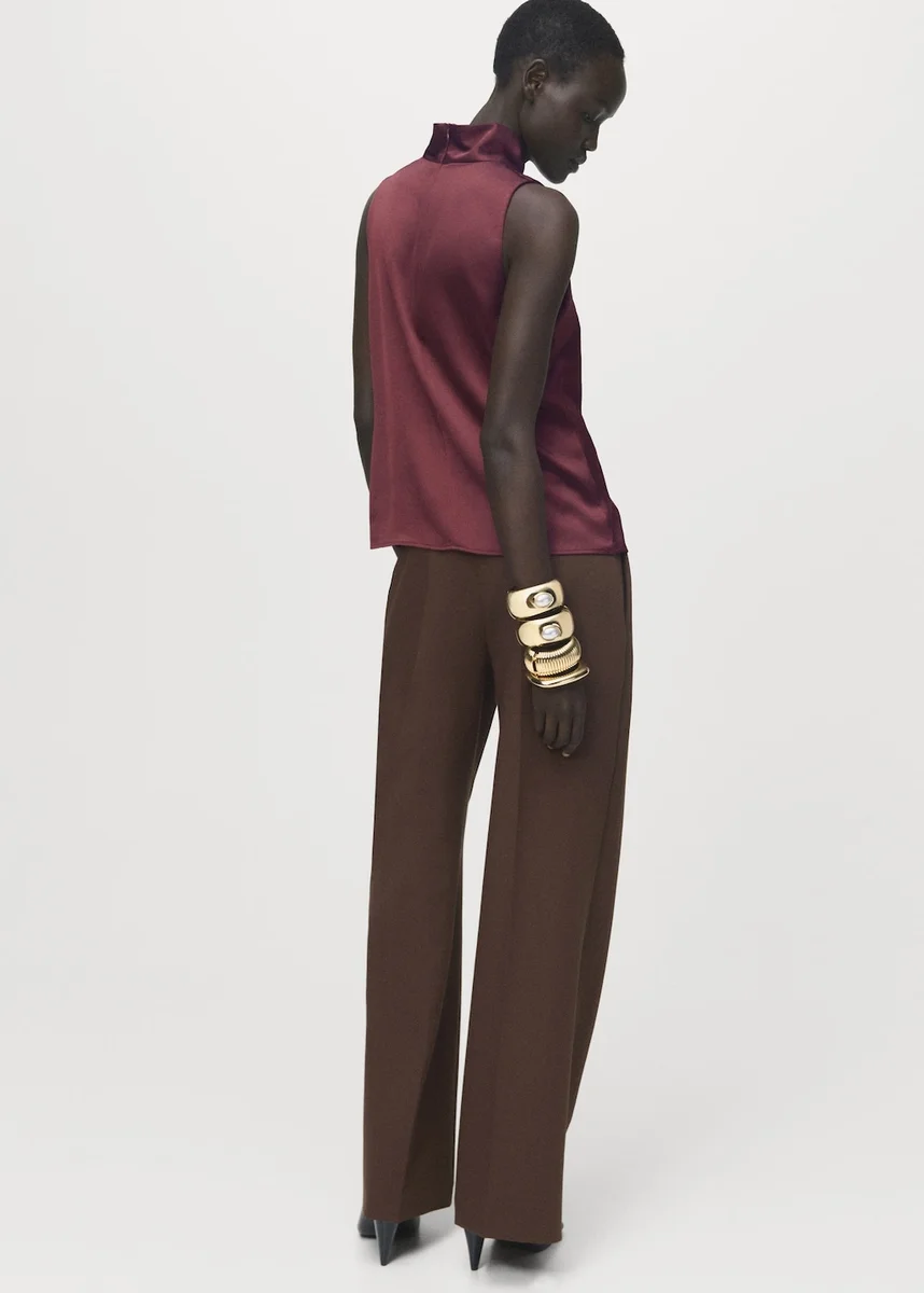 Tento oděv je vyroben ze saténové tkaniny a má rovný střih s vysokým výstřihem a bez rukávů. Díky zapínání na zip na zadní straně se snadno obléká. K dispozici v nadměrné velikosti.