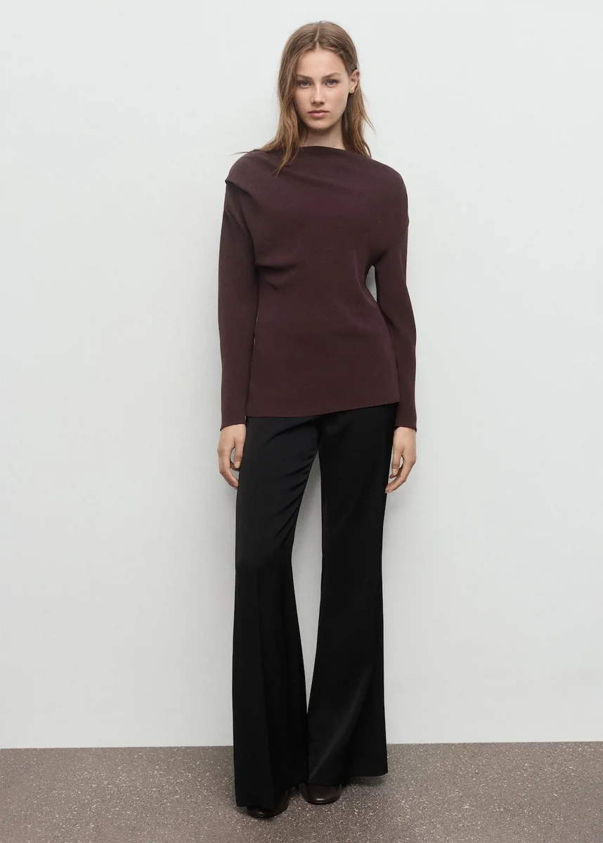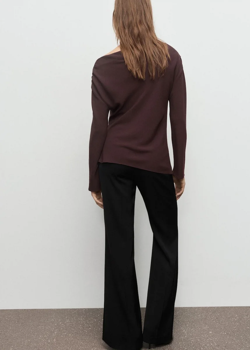 Tento model má asymetrický výstřih, dlouhé rukávy a řasení na ramenou.