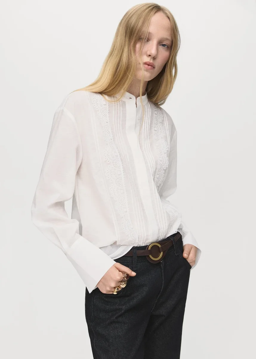 Tato halenka z bavlněné látky má rovný střih s límečkem. Dlouhé rukávy s manžetami na knoflíky a krajkovými detaily dodávají blůze zvláštní nádech. Zapínání na knoflíky vpředu.