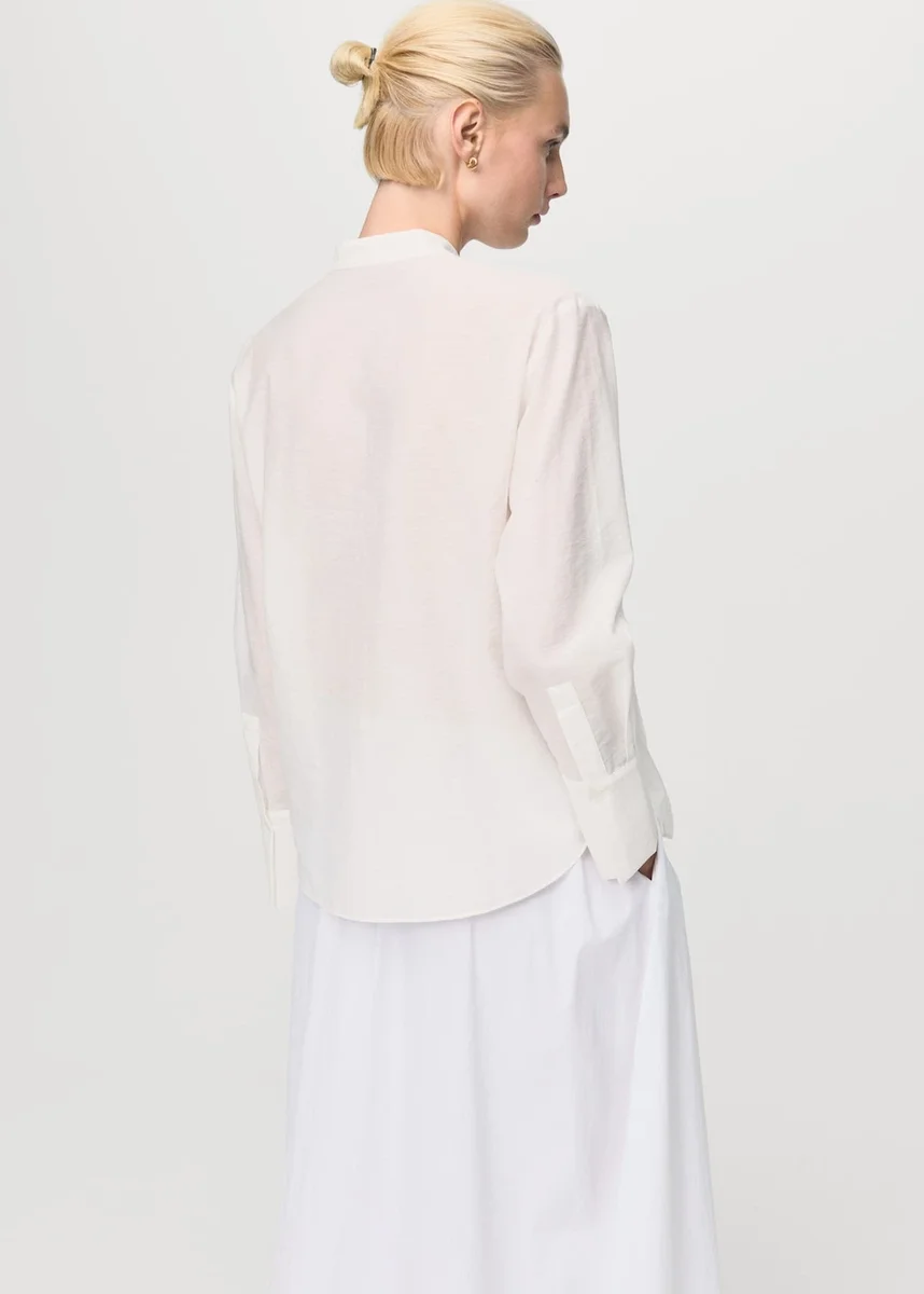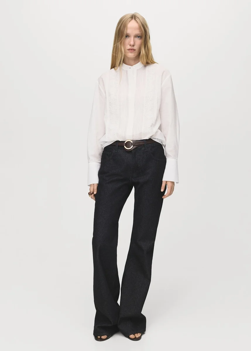 Tato halenka z bavlněné tkaniny má rovný střih s límečkem. Dlouhé rukávy s manžetami na knoflíky a krajkovými detaily dodávají blůze zvláštní nádech. Zapínání na knoflíky vpředu.