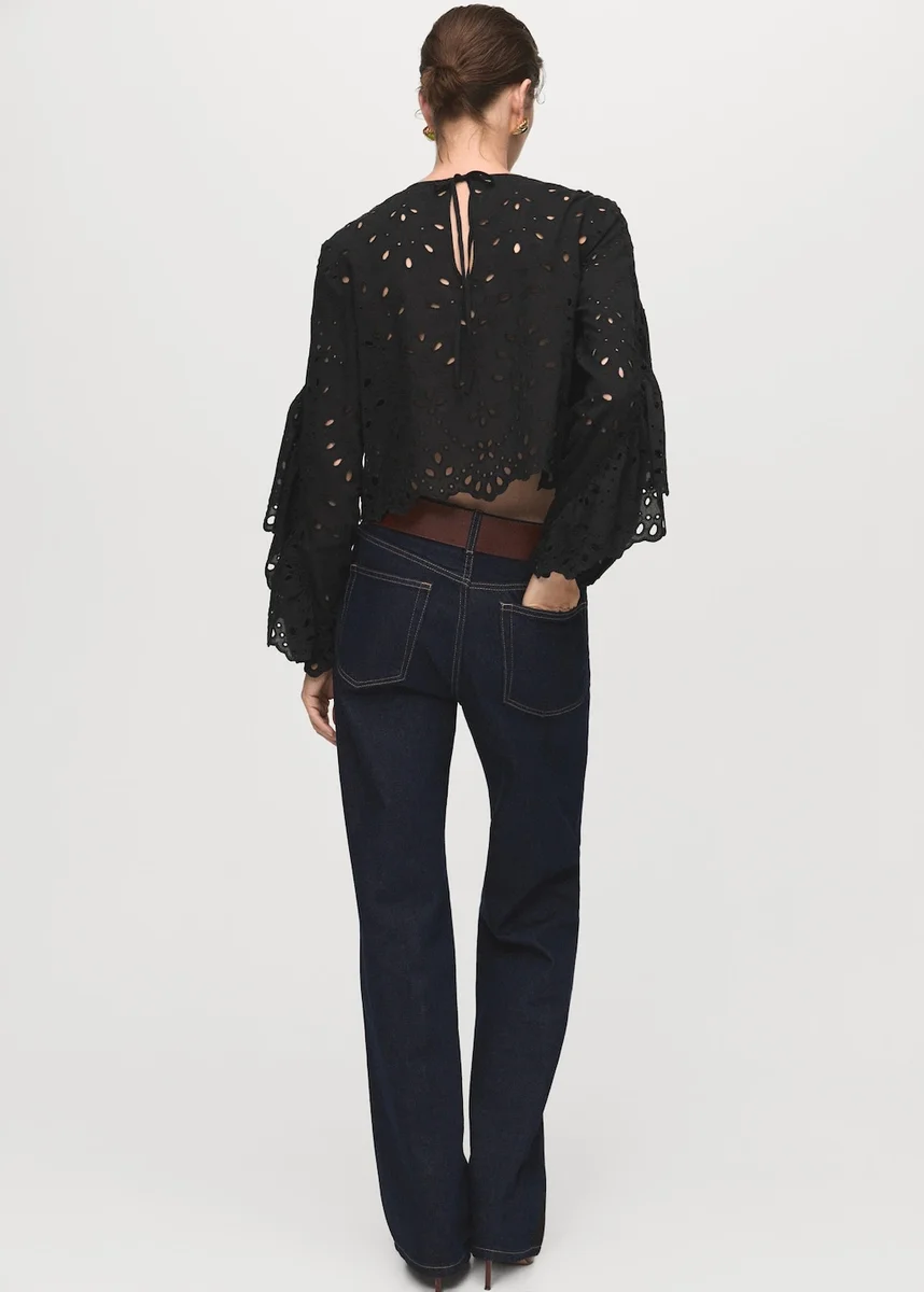 Tento model je ušitý z bavlněné směsi s anglickou výšivkou a má rovný střih s volánky, které mu dodávají pohyb. Kulatý výstřih a dlouhé rukávy doplňuje zavazování u krku.
