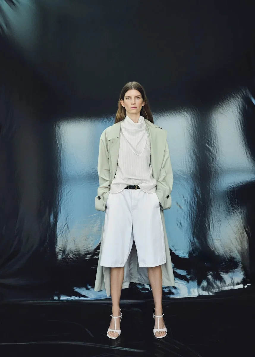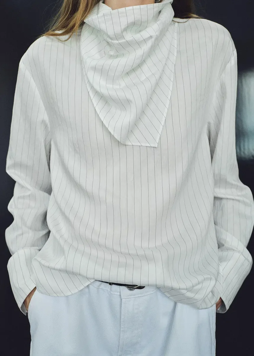 Tento model s rovným střihem a pruhy má kulatý výstřih a dlouhé rukávy. Součástí je šátek na krk a zapínání na knoflíky na zadní straně. K dispozici v nadměrných velikostech
