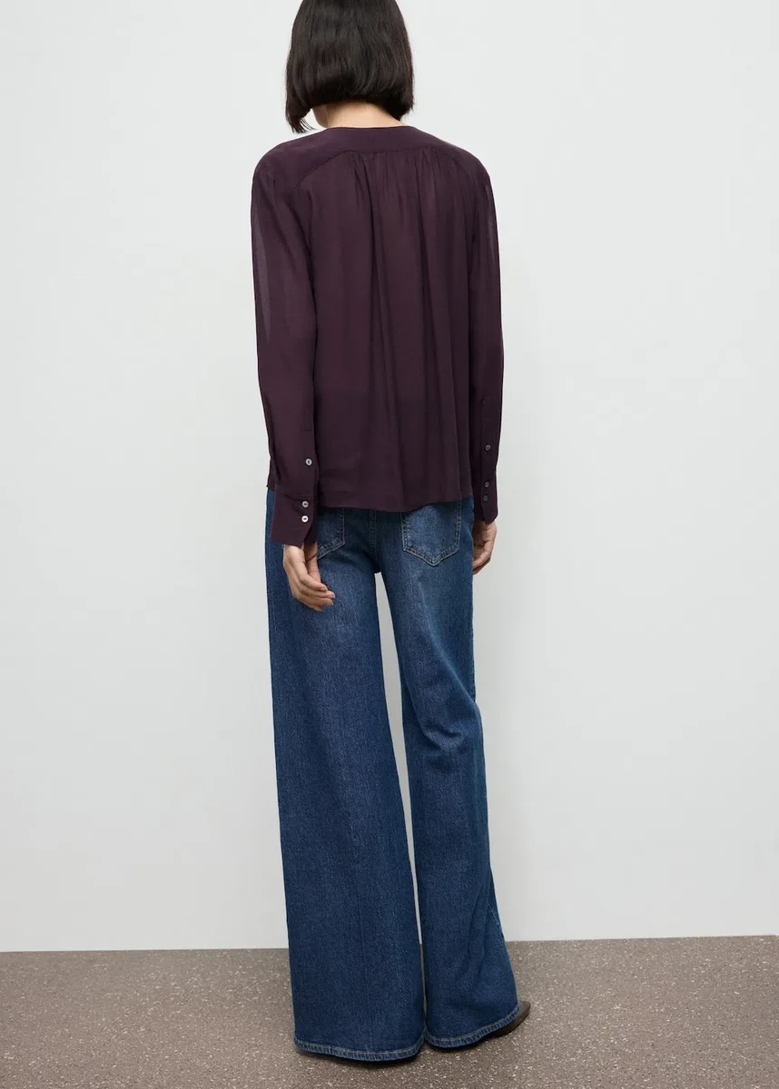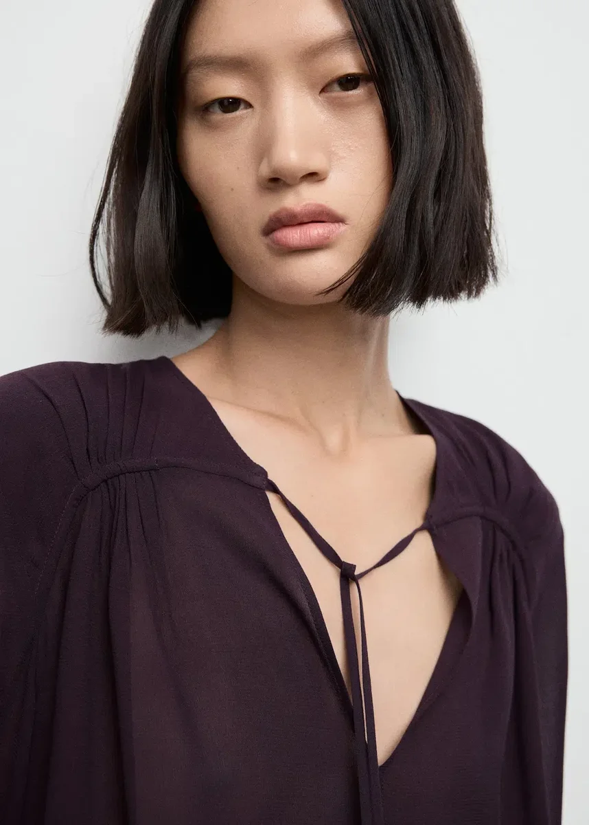 Tento oděv je vyroben ze šifonu a má rovný střih s hlubokým výstřihem. Výstřih je zdobený mašlí, dlouhé rukávy mají manžety na knoflíky.