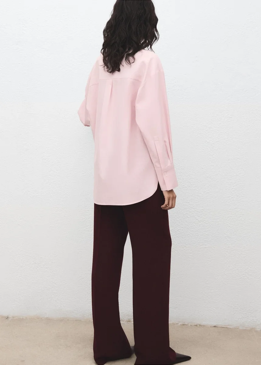 Tento oděv je vyroben z bavlněné směsi a má oversized střih s košilovým límcem. Má dlouhé rukávy s manžetami na knoflíky, našitou kapsu na hrudi a zapínání na knoflíky vpředu.