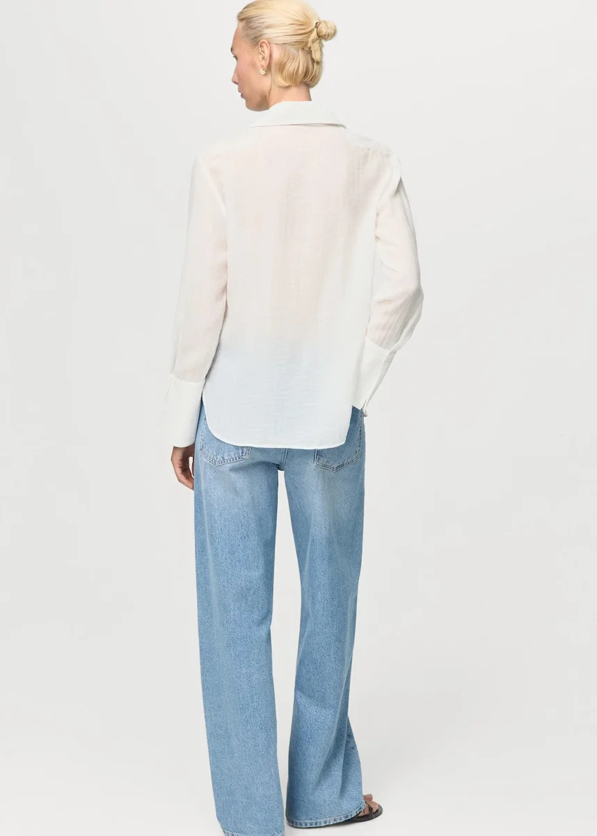 Tento oděv je vyroben z lyocellové směsi a má rovný střih s košilovým límcem. Dlouhé rukávy mají manžety na knoflíky a ozdobné nášivky. Design doplňuje skryté zapínání na knoflíky vpředu. K dispozici v nadměrných velikostech