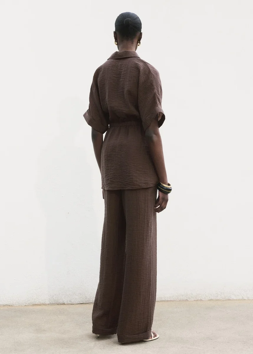 Tkanina ze směsi lyocellu. Zmačkaný efekt. Dlouhý střih. Košilový límec. Krátké rukávy s ohrnutými manžetami. Zapínání na knoflíky vpředu. Elastický pas se zavazováním. Celkový vzhled