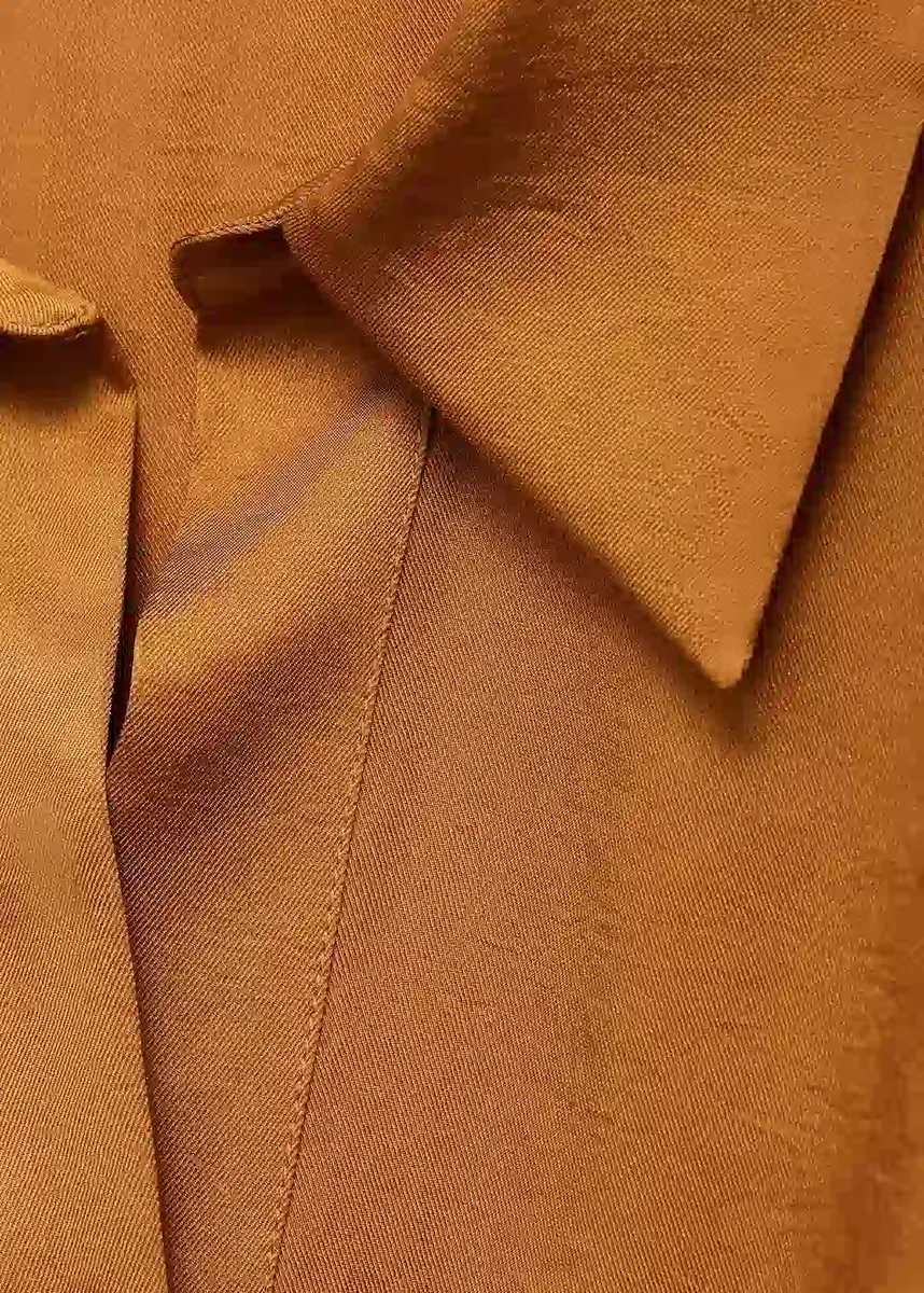 Tento oděv je vyroben ze saténové tkaniny a má zavinovací střih s košilovým límcem. Dlouhé rukávy mají manžety na knoflíky a přední zapínání zahrnuje skryté knoflíky.