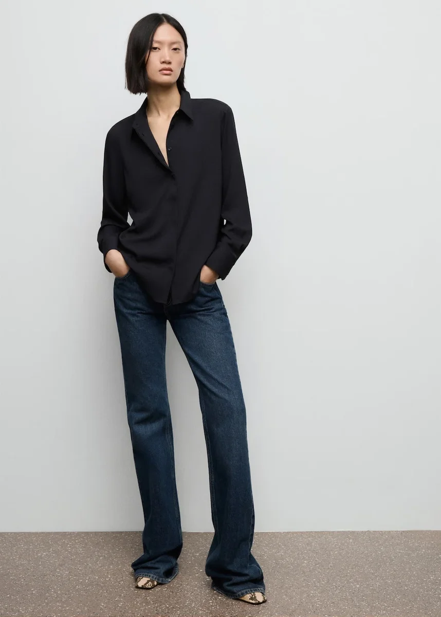 Tento model z plynulé látky má rovný střih a košilový límec. Dlouhé rukávy mají manžety na knoflíky a přední zapínání je na knoflíky. K dispozici v nadměrných velikostech