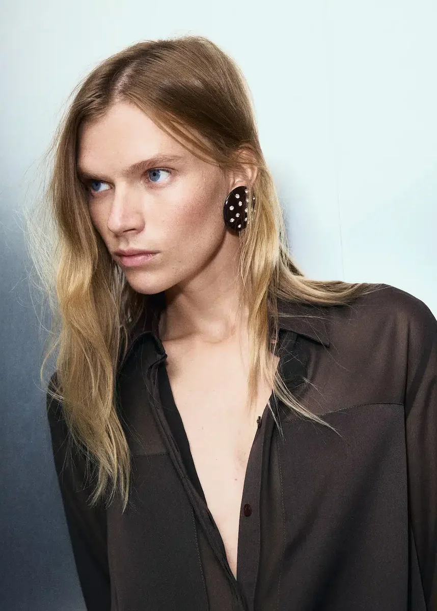 Tento model je ušitý z poloprůsvitné látky a má rovný střih s košilovým límcem a dlouhými rukávy s manžetami na knoflíky. Dekorativní nášivky dodávají oděvu osobitý vzhled. Zapínání je na skryté knoflíky vpředu.