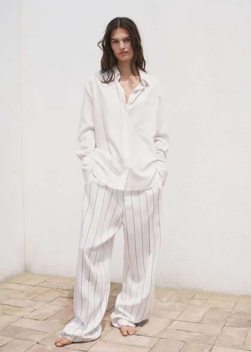 Pružný materiál. Poloprůsvitný design. Rovný střih. Pruhovaný potisk. Košilový límec. Dlouhé rukávy s manžetami na knoflíky. Nášivková kapsa na hrudi. Zapínání na knoflíky vpředu.
