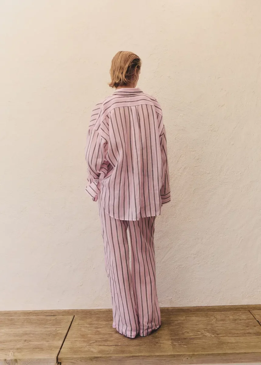 100% ramie. Oversized střih. Pruhovaný vzor. Košilový límec. Dlouhé rukávy. Zapínání na knoflíky vpředu. Total look.