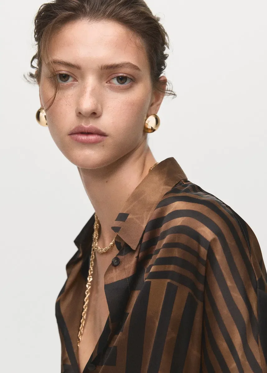 Tento oděv je vyroben ze saténové tkaniny a má rovný střih s kombinovaným pruhovaným vzorem. Má košilový límec a dlouhé rukávy s manžetami na knoflíky. Dodává se s kalhotami ve stejném provedení.