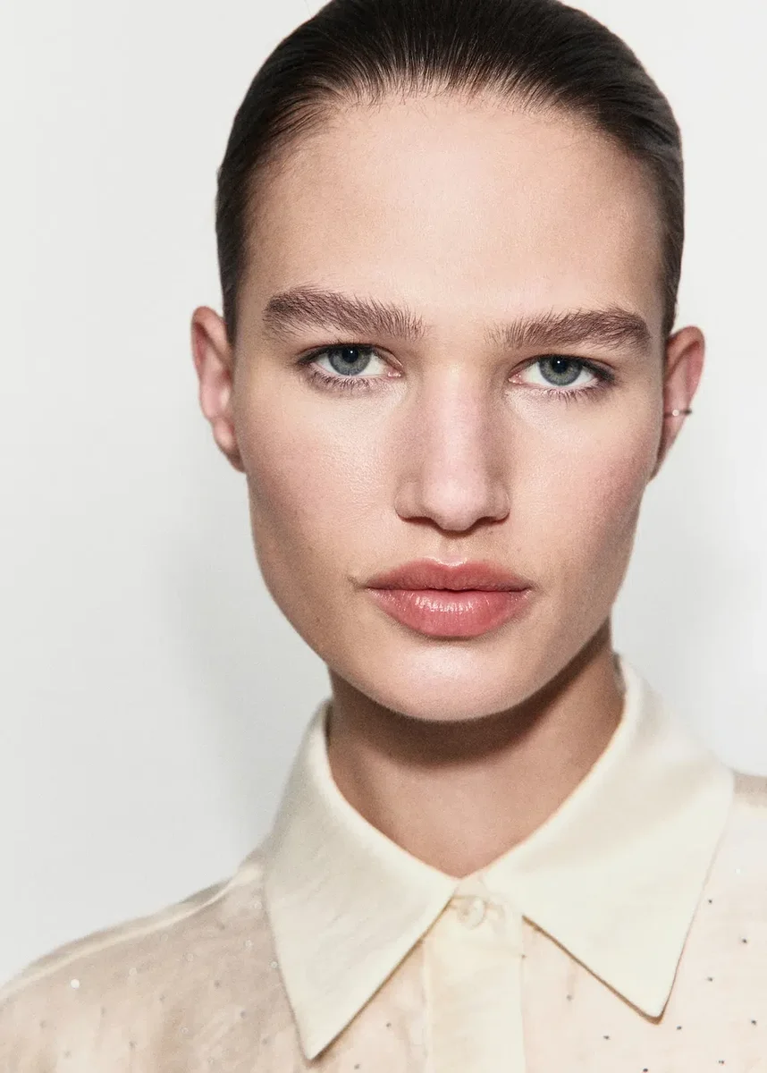 Tento model je ušitý ze saténové tkaniny a má rovný střih s detaily z kamínků. Má košilový límec a dlouhé rukávy s manžetami na knoflíky. Skrytý zapínání na knoflíky vpředu dotváří jeho styl. K dispozici v nadměrných velikostech.