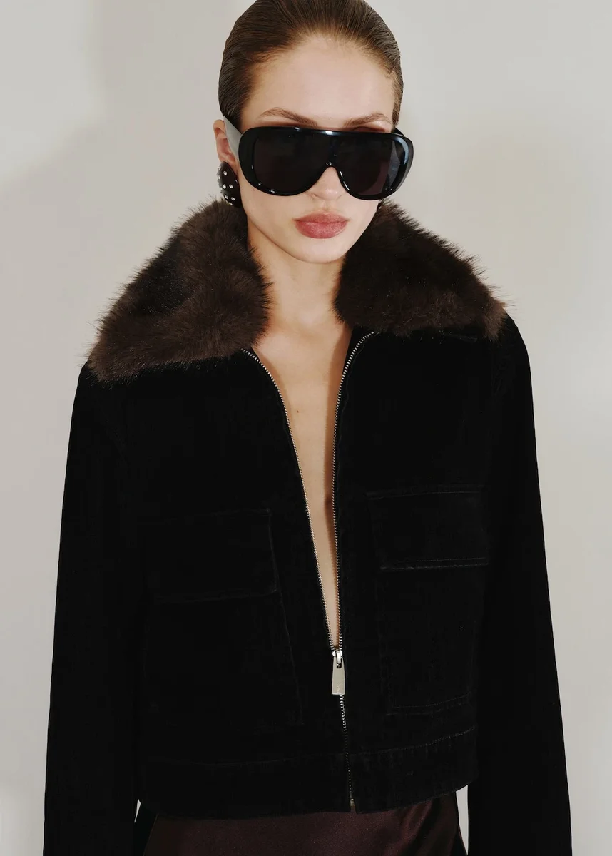 Sametová tkanina. Směs bavlny. Pohodlná tkanina s elasticitou. Krátký střih. Rovný střih. Límec s kožešinovým efektem. Dlouhé rukávy. Dvě našité kapsy a přední kapsy s klopou. Zapínání na zip vpředu. Vnitřní podšívka