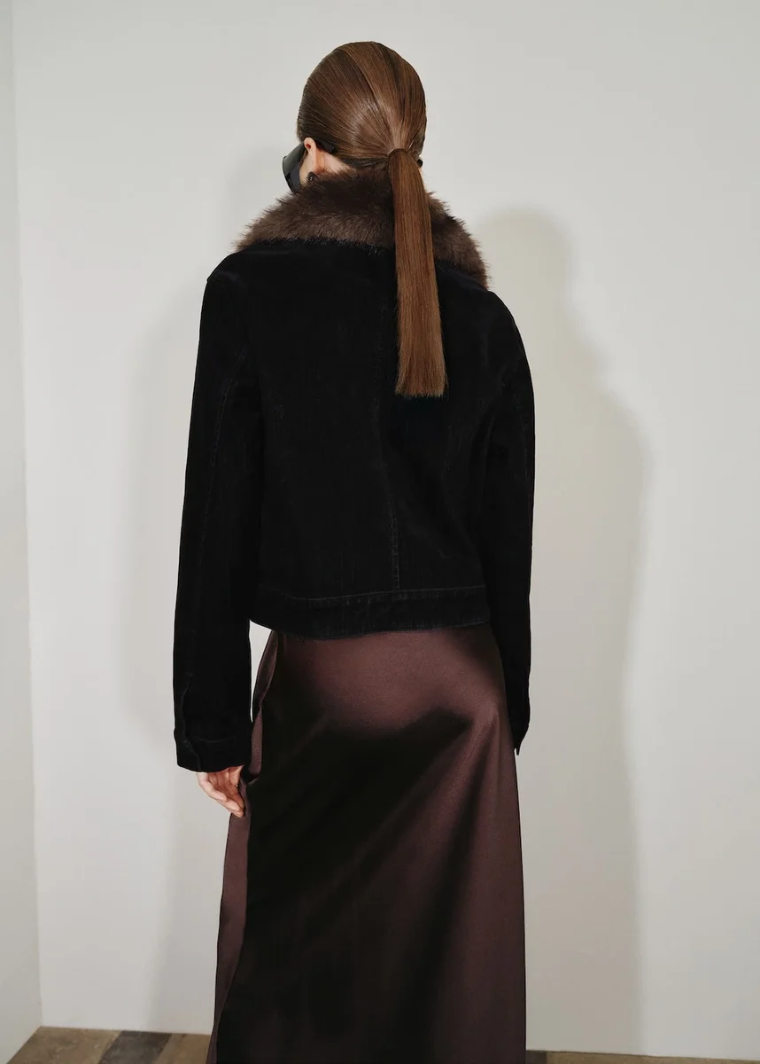Sametová tkanina. Bavlněná směsová tkanina. Pohodlná tkanina s elasticitou. Krátký střih. Rovný střih. Košilový límec s kožešinovým efektem. Dlouhé rukávy. Dvě našité kapsy a přední kapsy s klopou. Zapínání na zip vpředu. Vnitřní podšívka.