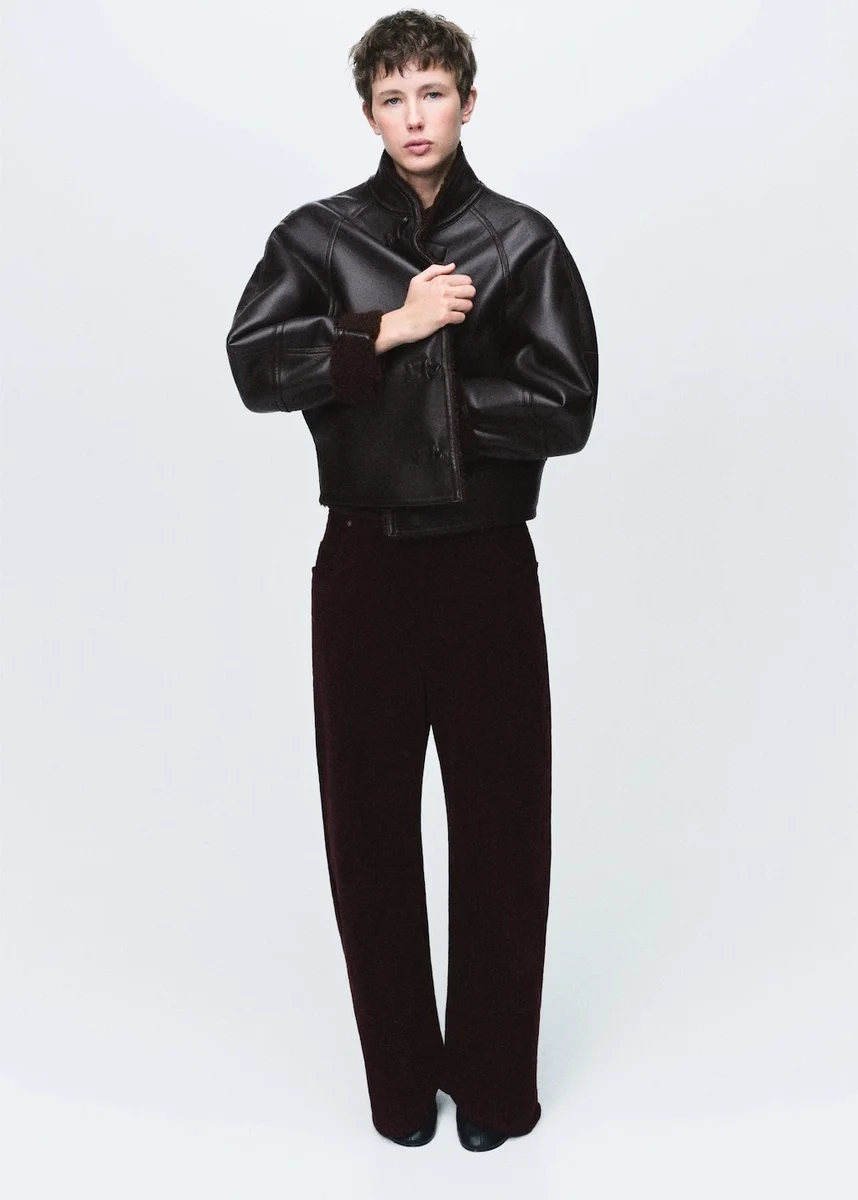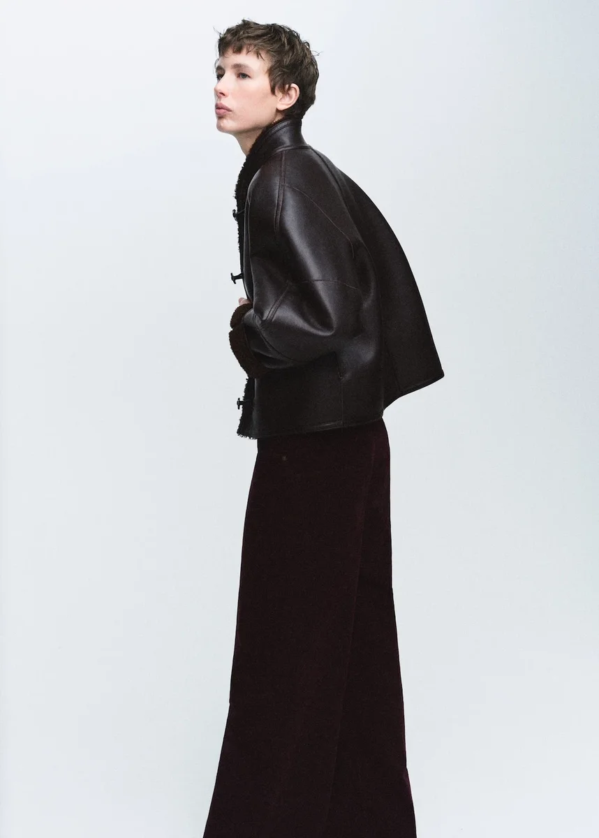 Materiál sherpa. Oboustranný design. Oversized střih. Rovný střih. Vysoký límec. Dlouhé rukávy. Zapínání na knoflíky vpředu