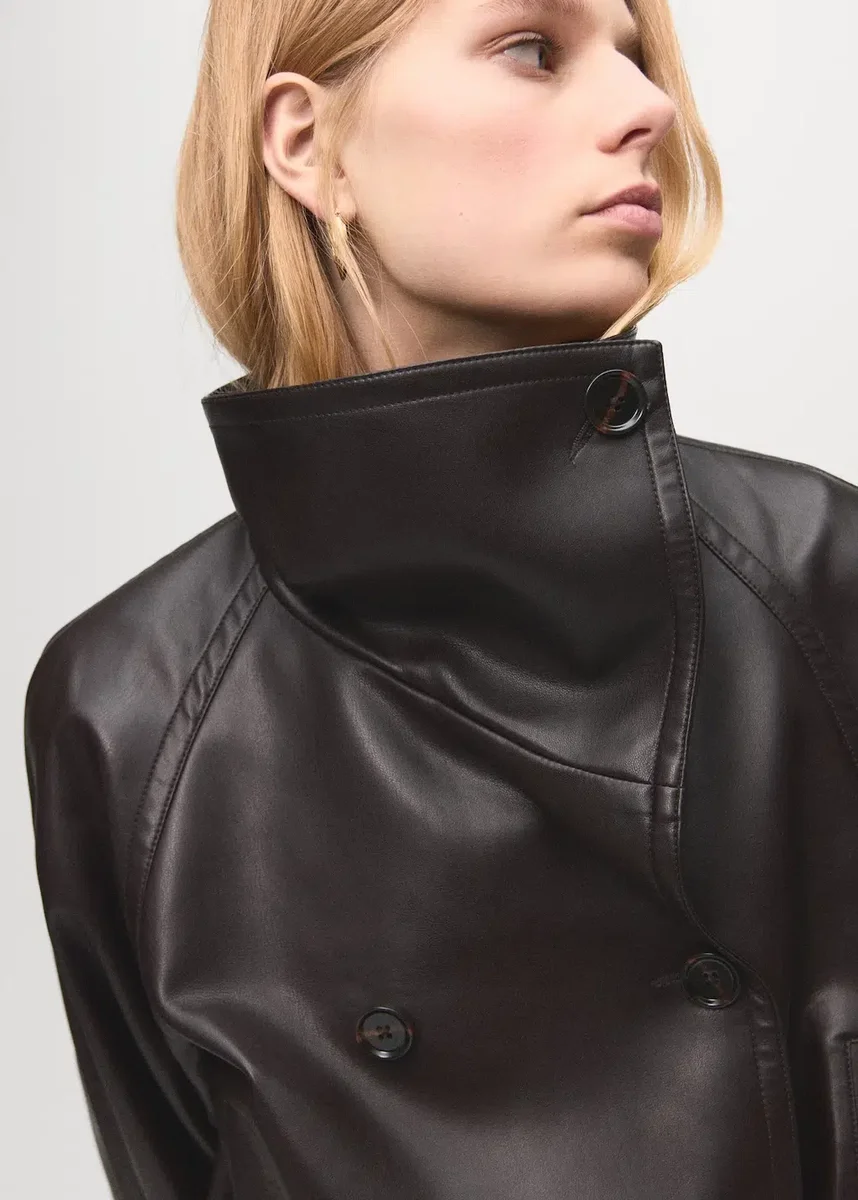 Kožený efekt. Oversized střih. Krátký střih. Široké klopy. Dlouhé rukávy s manžetami na knoflíky. Dvě boční kapsy. Zapínání na dva knoflíky. Pásek ve stylu noční košile. Vnitřní podšívka. Exkluzivně online