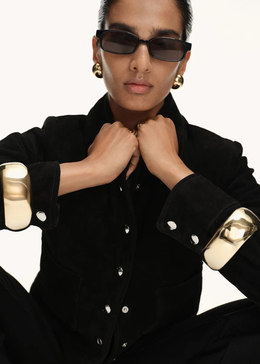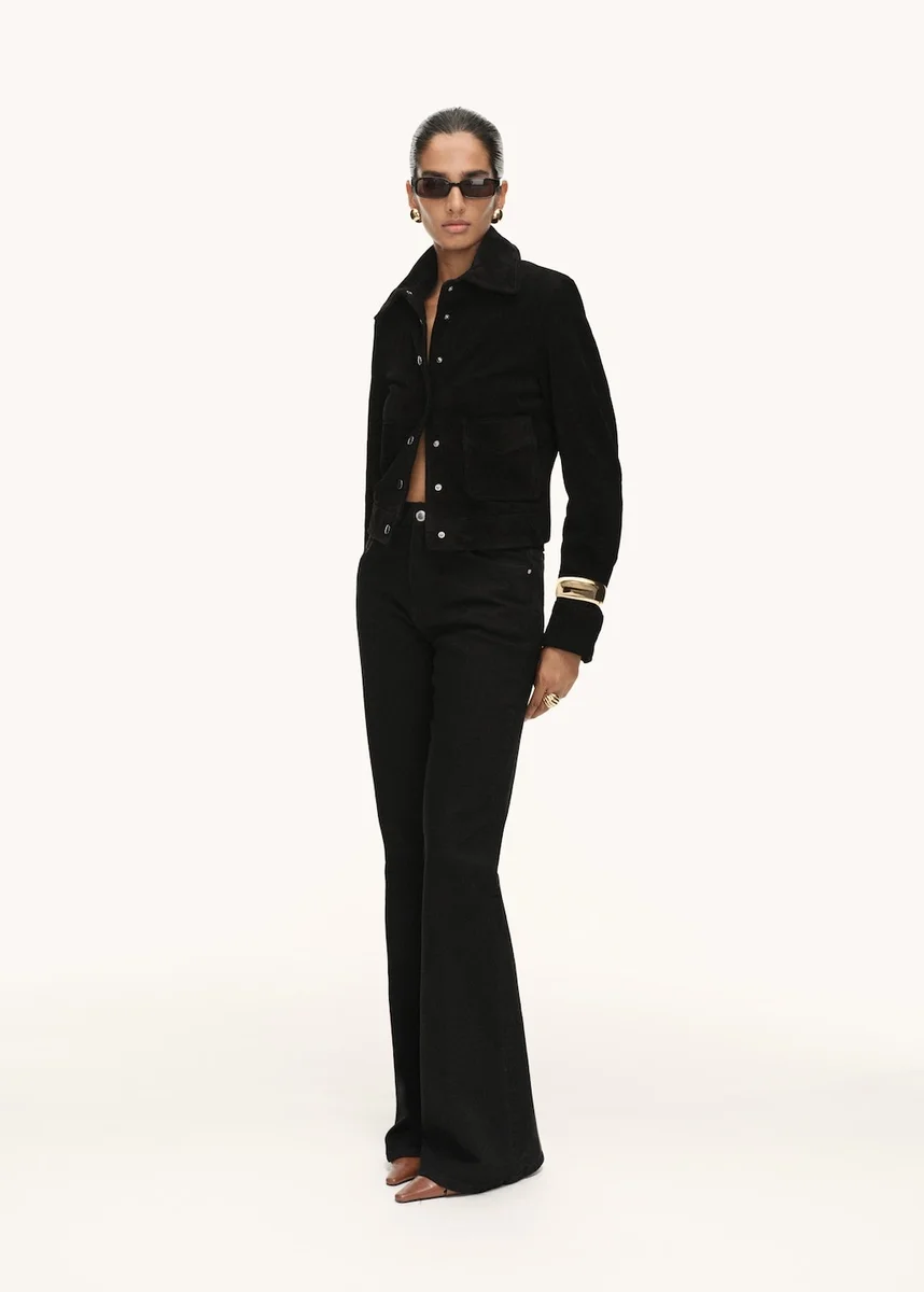100 % hovězí kůže. Semiš. Krátký střih. Rovný střih. Košilový límec. Dlouhé rukávy. Dvě našité kapsy a přední kapsy s klopou. Zapínání na knoflíky vpředu. Vnitřní podšívka