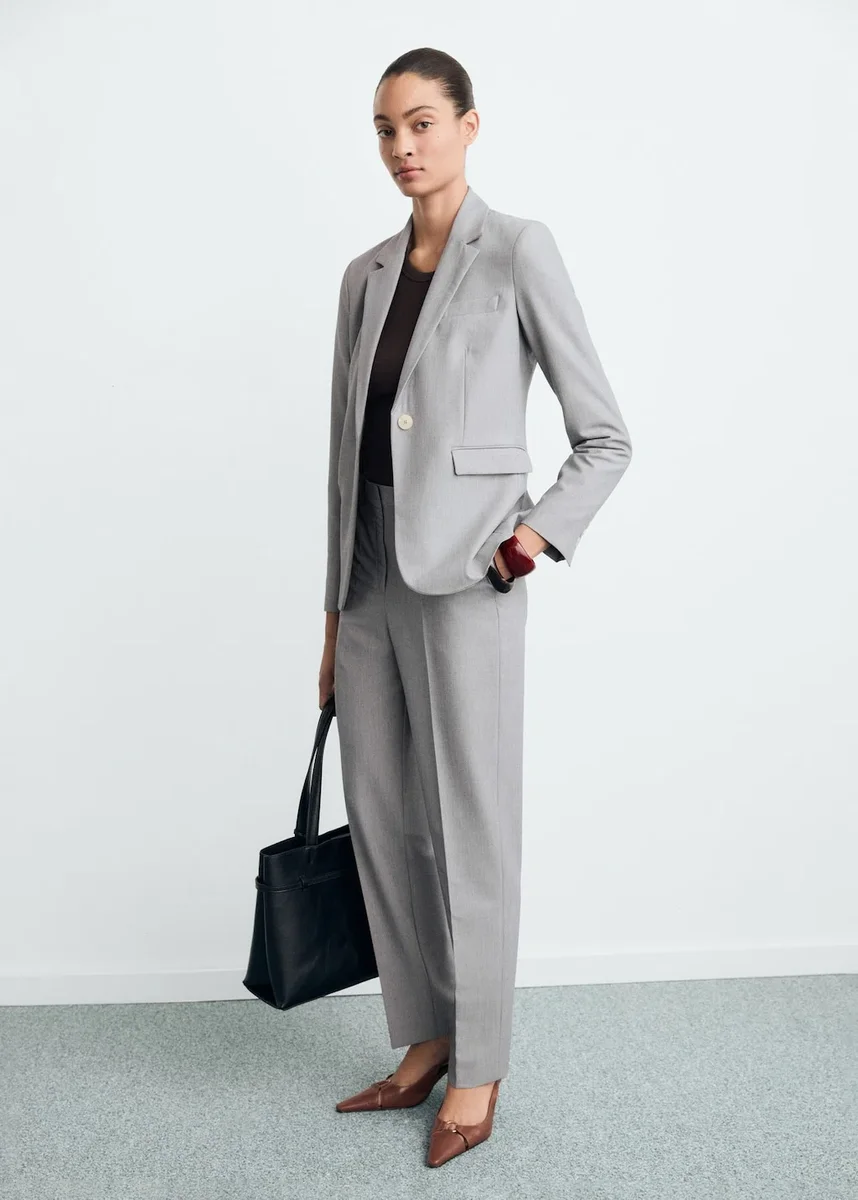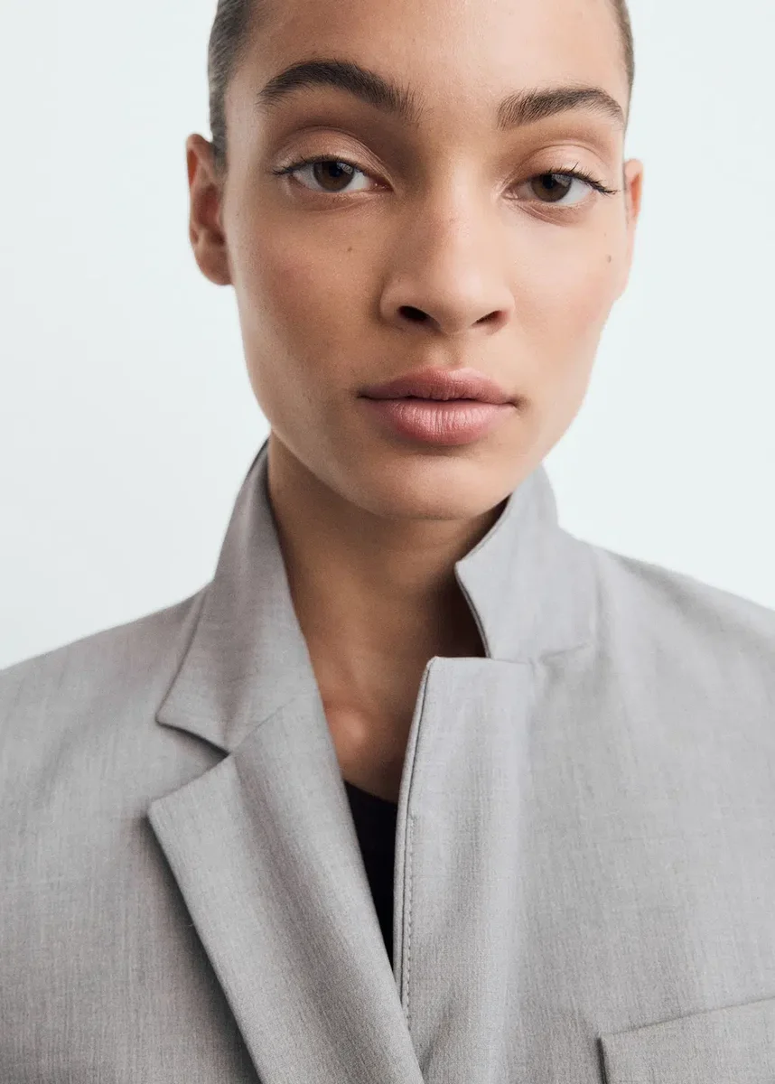 Přiléhavý střih. Límec s klopami a výstřihem do V. Klopové límce. Dlouhé rukávy. Manžety na knoflíky. Kontrastní knoflíky. Dvě kapsy s klopami na přední straně. Jedna kapsy s paspulkou na hrudi. Zapínání na knoflíky vpředu. Rozparek vzadu. Vnitřní podšívka. Celkový vzhled. Růžová barva je exkluzivně k dispozici online.