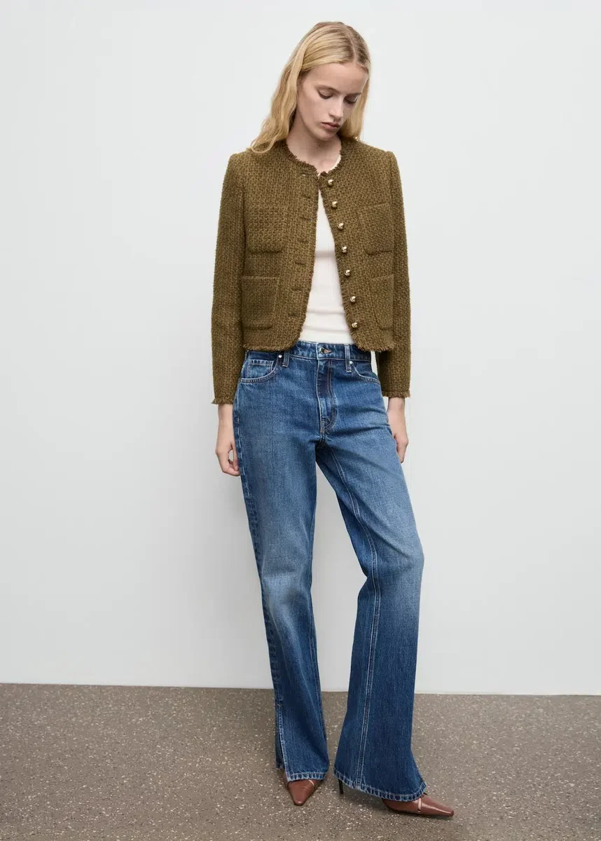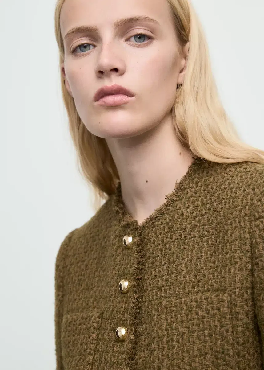 Směs bavlny a vlny. Tvídová tkanina. Rovný střih. Kulatý výstřih. Dlouhé rukávy. Manžety na knoflíky. Dvě přední našité kapsy. Zapínání na knoflíky vpředu. Roztřepený lem. Pouze podšívka. K dispozici v nadměrných velikostech