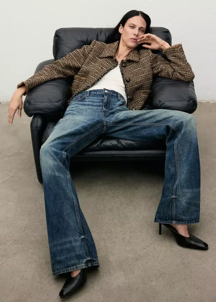 Tvídová tkanina. Rovný střih. Košilový límec. Odnímatelný límec s kožešinovým efektem. Dlouhé rukávy. Dvě přední našité kapsy. Roztřepený lem. Zapínání na knoflíky vpředu. Vnitřní podšívka