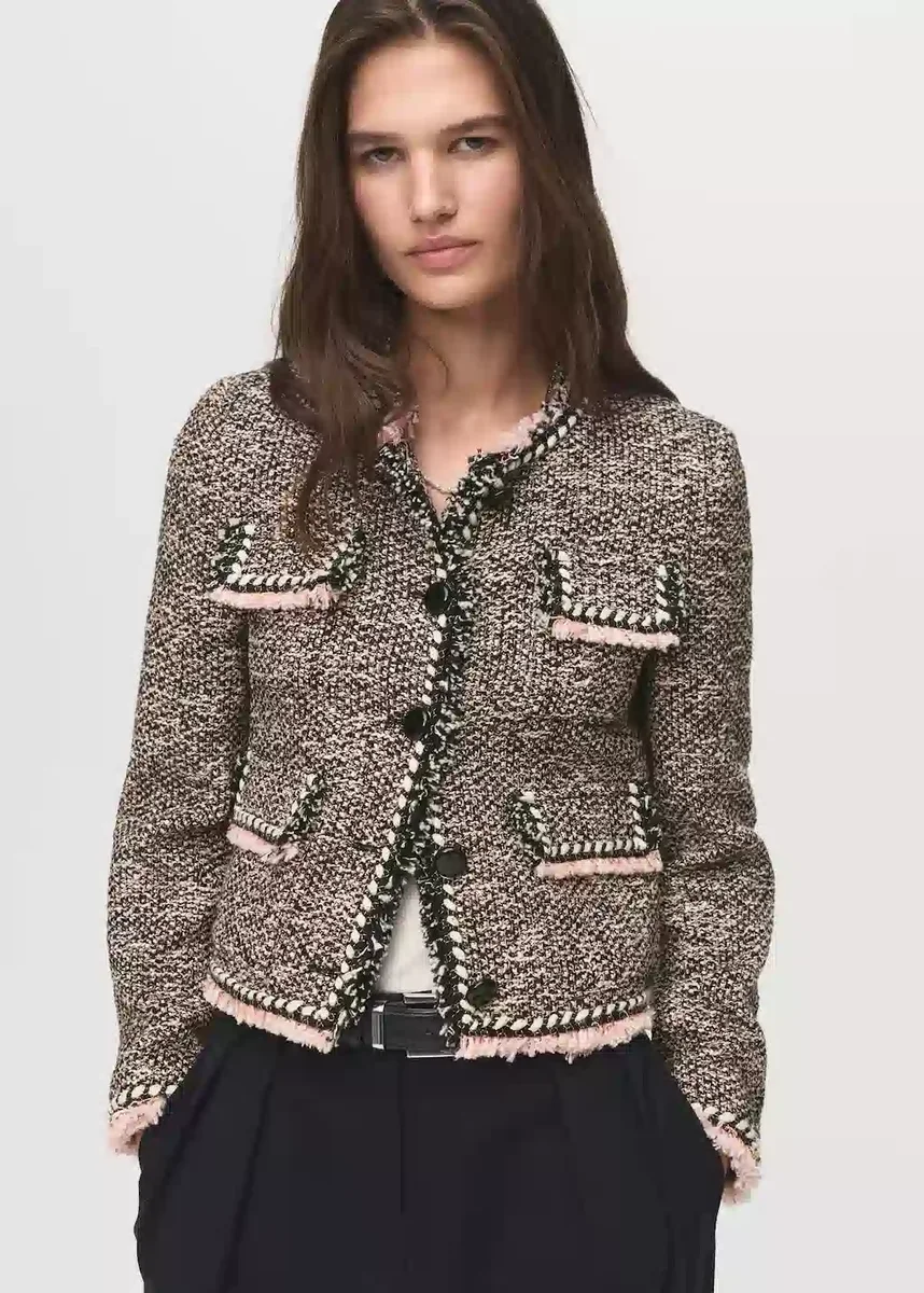 Tvídová tkanina. Rovný střih. Kulatý výstřih. Dlouhé rukávy. Čtyři kapsy s klopou na přední straně. Kontrastní lemování. Roztřepený povrch. Zapínání na knoflíky vpředu. Vnitřní podšívka