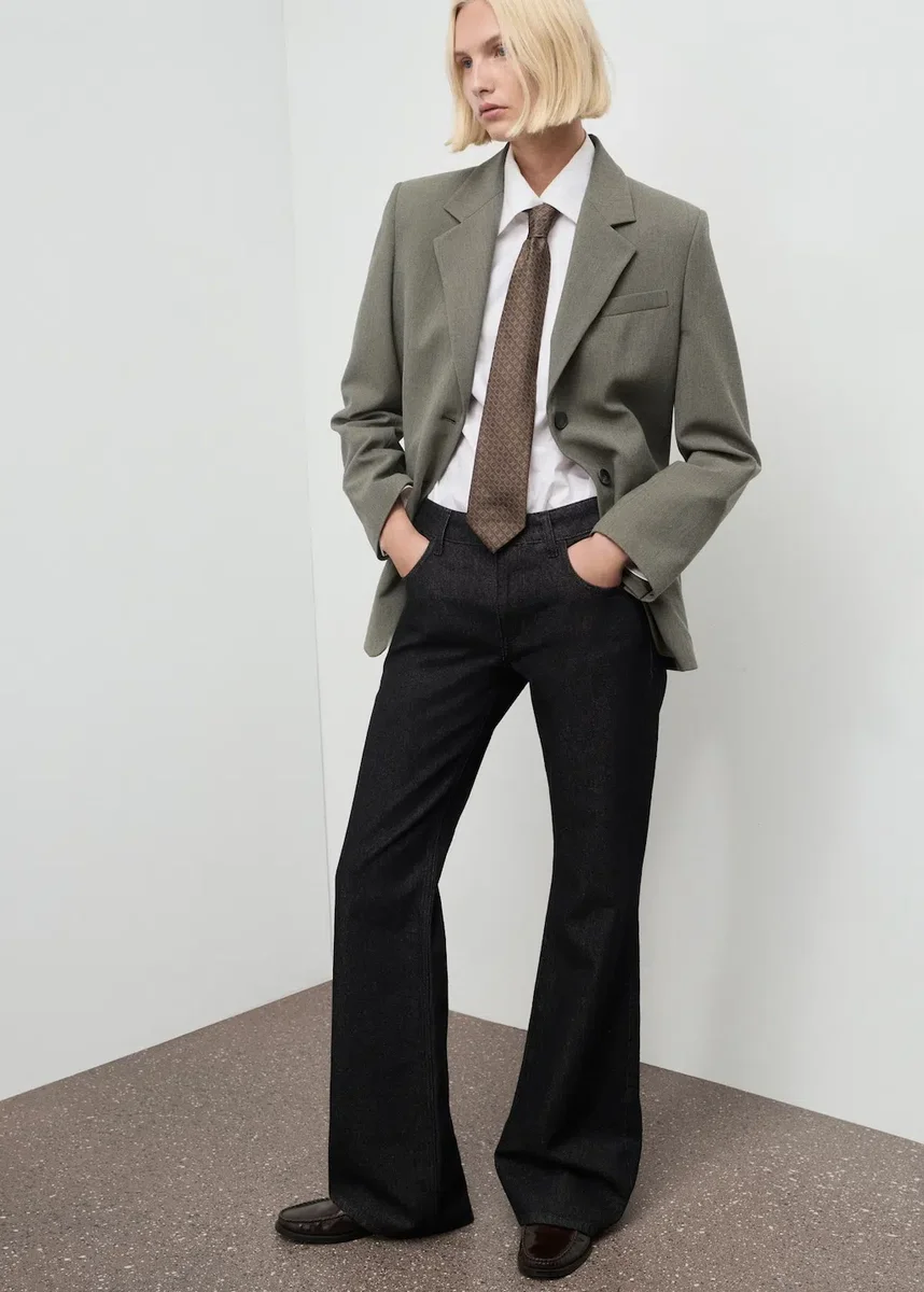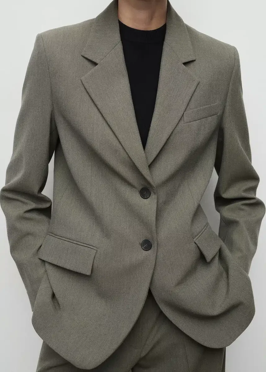 Rovný střih. Límec s klopami a výstřihem do V. Klopové límce. Dlouhé rukávy s manžetami na knoflíky. Náprsní kapsa s lemováním. Dvě kapsy s klopami na přední straně. Zadní rozparek na spodním lemu. Zapínání na knoflíky vpředu. Vnitřní podšívka. Celkový vzhled. K dispozici ve velikostech Plus.