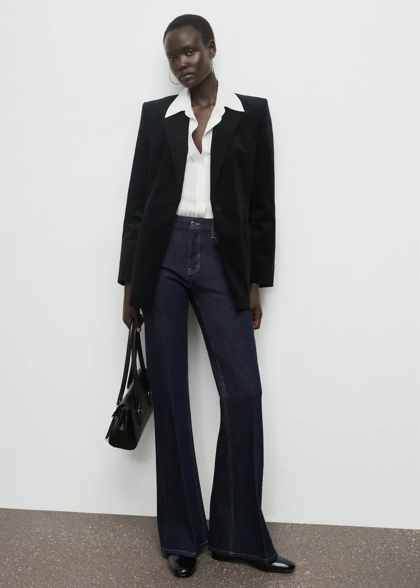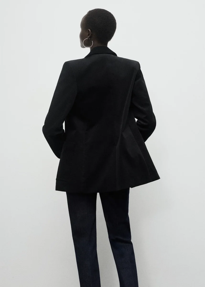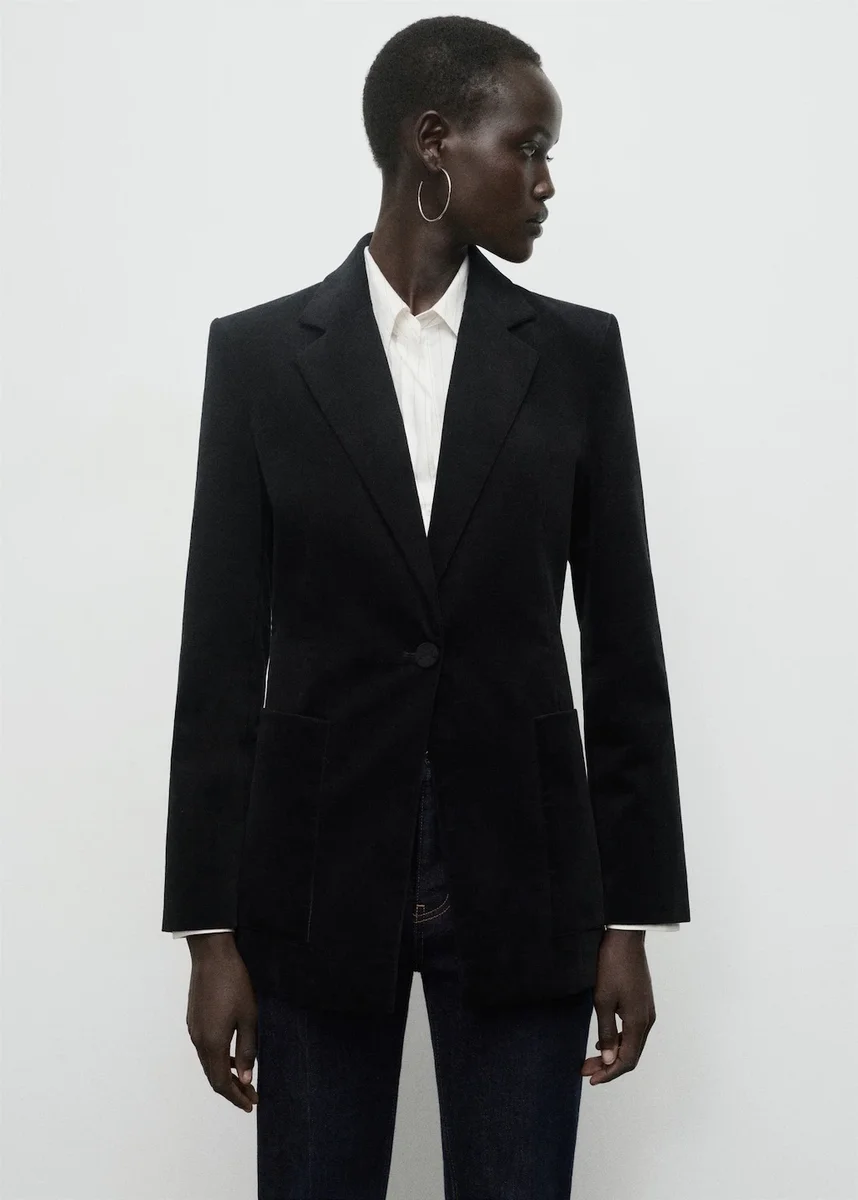 Sametová tkanina. Rovný střih. Límec s klopami a výstřihem do V. Klopy s výřezem. Dlouhé rukávy. Dvě přední našité kapsy. Zapínání na knoflíky vpředu. Vnitřní podšívka. K dispozici v nadměrných velikostech. Exkluzivně online