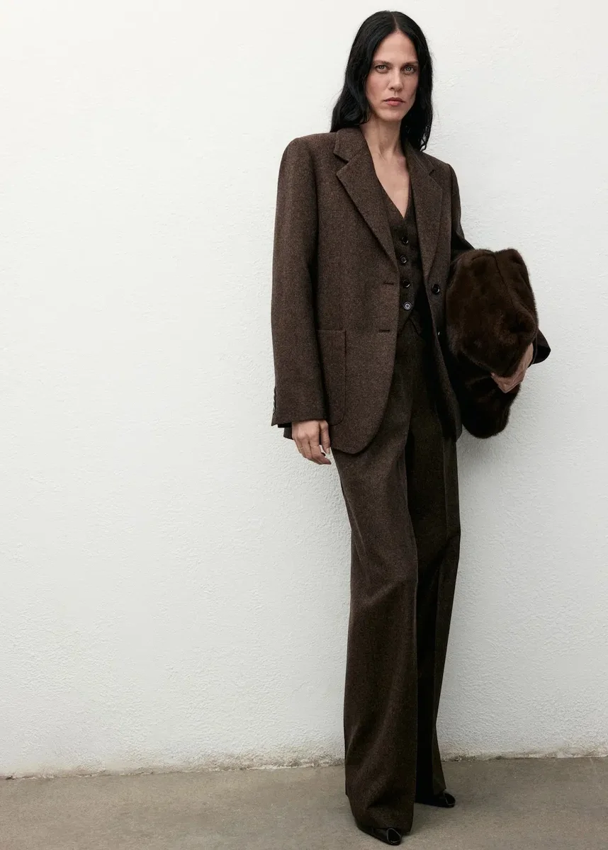 Styl obleku. Směsová vlna. Žakárový vzor s tečkami. Rovný střih. Límec s klopami a výstřihem do V. Klopy s výřezem. Dlouhé rukávy s manžetami na knoflíky. Dvě přední našité kapsy. Zadní rozparek na spodním lemu. Zapínání na knoflíky vpředu. Vnitřní podšívka. Celkový vzhled. K dispozici v nadměrných velikostech.