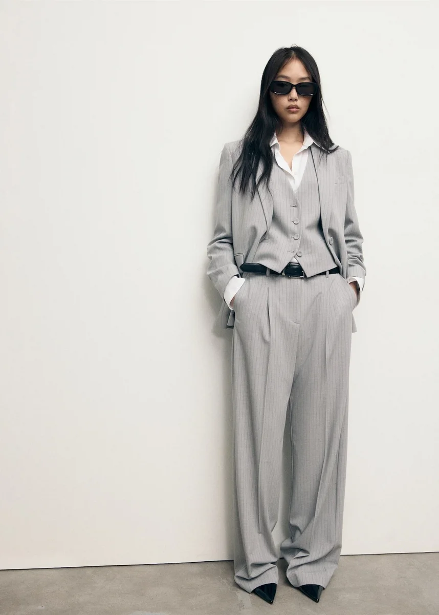 Rovný střih. Pruhovaný design. Límec s klopami a výstřihem do V. Klopové límce. Dlouhé rukávy s manžetami na knoflíky. Náprsní kapsa s lemováním. Dvě kapsy s klopami na přední straně. Zapínání na knoflíky vpředu. Vnitřní podšívka. Celkový vzhled. K dispozici v nadměrných velikostech