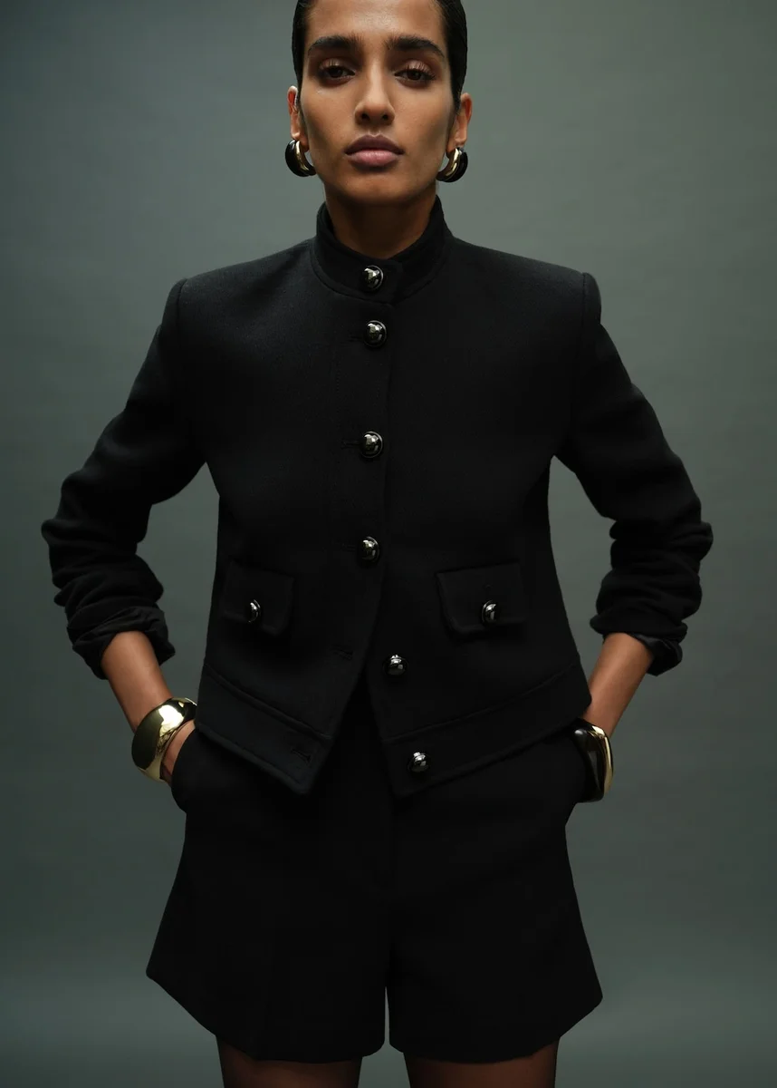 Směs bavlny. Rovný střih. Stojací límec. Dlouhé rukávy. Knoflíky s efektem drahokamu. Dvě kapsy s klopou a knoflíkem na přední straně. Zapínání na knoflíky vpředu. Vnitřní podšívka