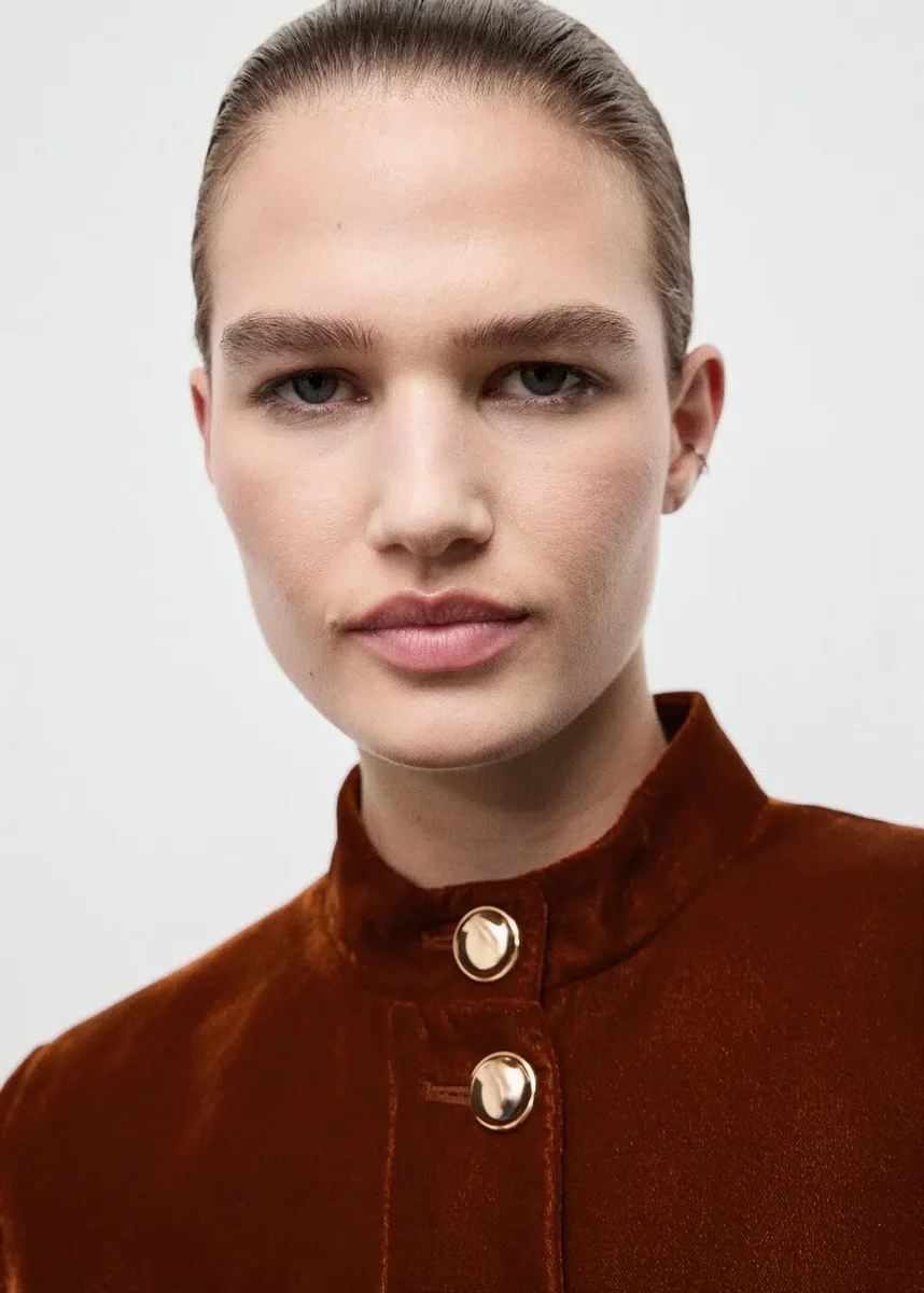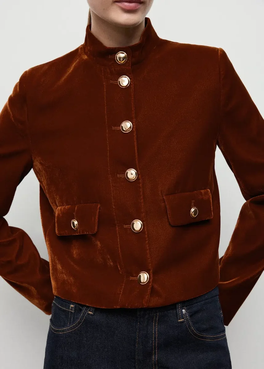 Sametová tkanina. Krátký střih. Rovný střih. Stojací límec. Dlouhé rukávy. Dvě kapsy s klopou a knoflíkem na přední straně. Zapínání na knoflíky vpředu. Vnitřní podšívka. Tento oděv je součástí naší kolekce pro večírky a akce, která byla navržena tak, aby vylepšila váš vzhled při zvláštních příležitostech.