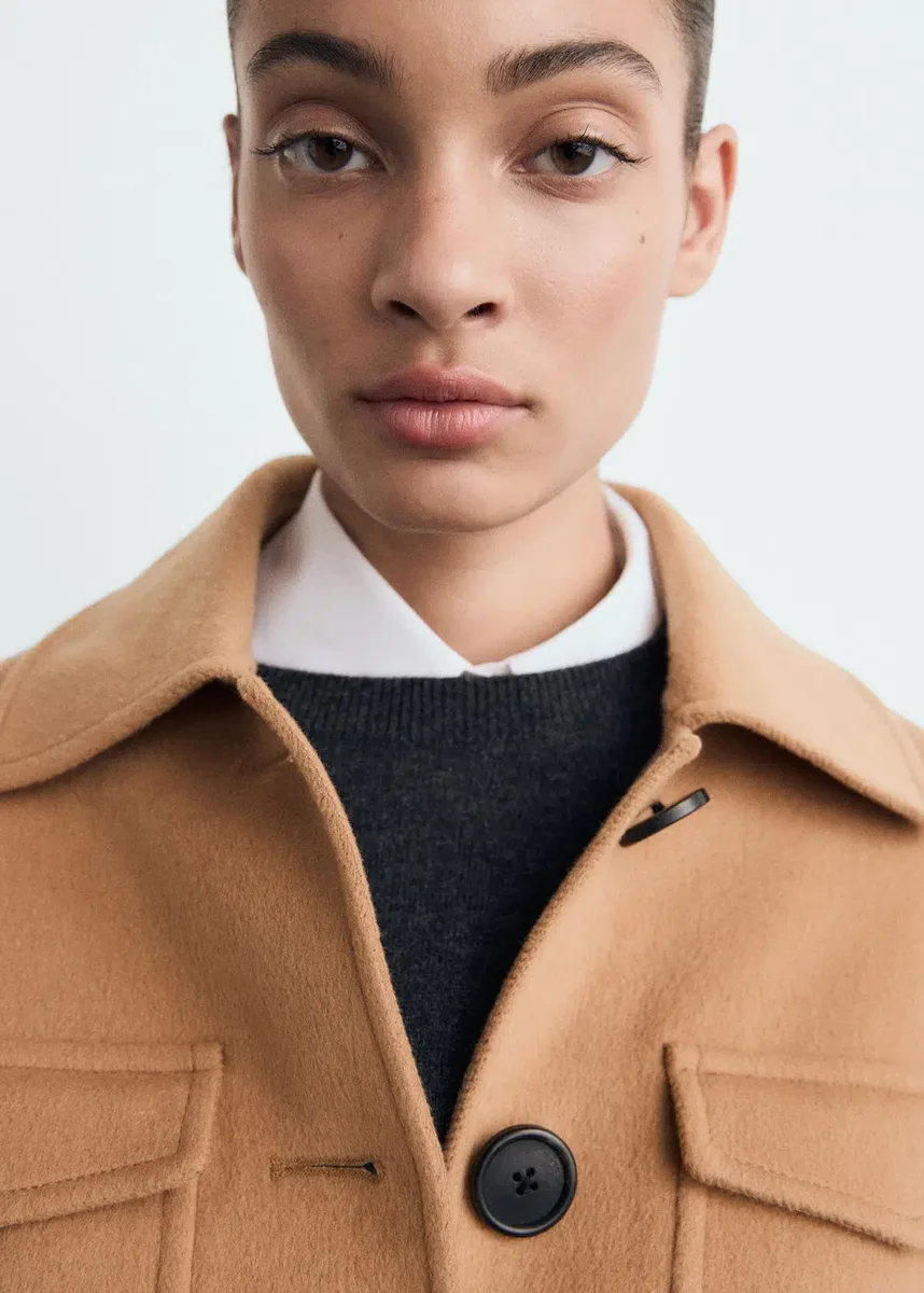 Směs vlny. Rovný střih. Střední střih. Košilový límec. Dlouhé rukávy. Čtyři našité kapsy na přední straně. Zapínání na knoflíky vpředu
