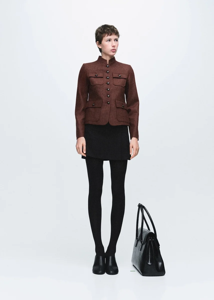 Směs vlny. Rovný střih. Stojací límec. Dlouhé rukávy. Čtyři našité kapsy s klopou na přední straně. Zapínání na knoflíky vpředu. Vnitřní podšívka. Celkový vzhled