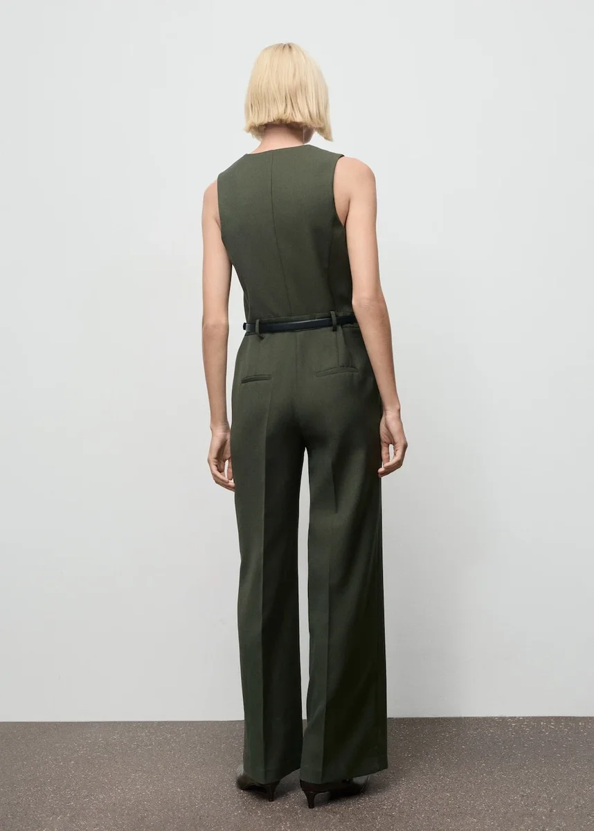 Dlouhý střih. Rovný střih. Výstřih do V. Bez rukávů. Široké ramínka. Dvě boční kapsy. Poutka na pásek. Zapínání na přezku. Dvě zadní kapsy s lemováním. Zapínání na zip a knoflík. Vnitřní podšívka.