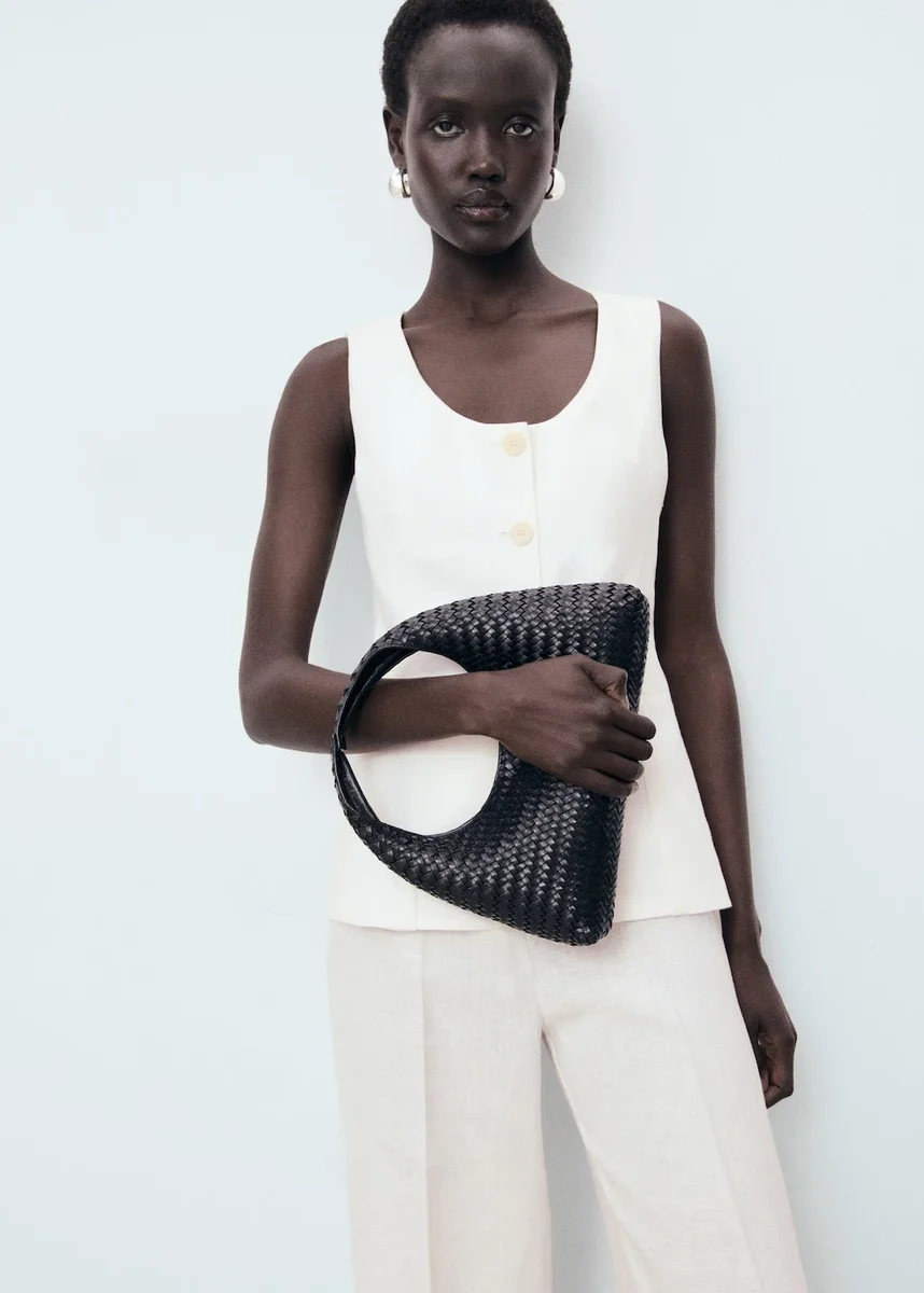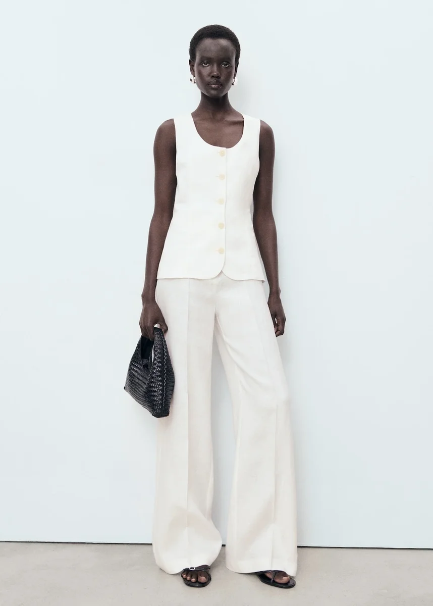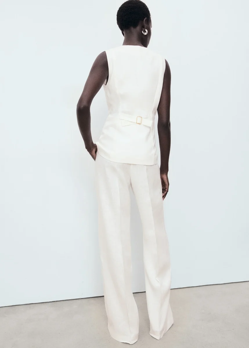 100% lněná tkanina. Dlouhý střih. Rovný střih. Střih jako u obleku. Hluboký výstřih. Detaily spony na zadní straně. Zapínání na knoflíky vpředu. Podšívka ze 100% bavlny.