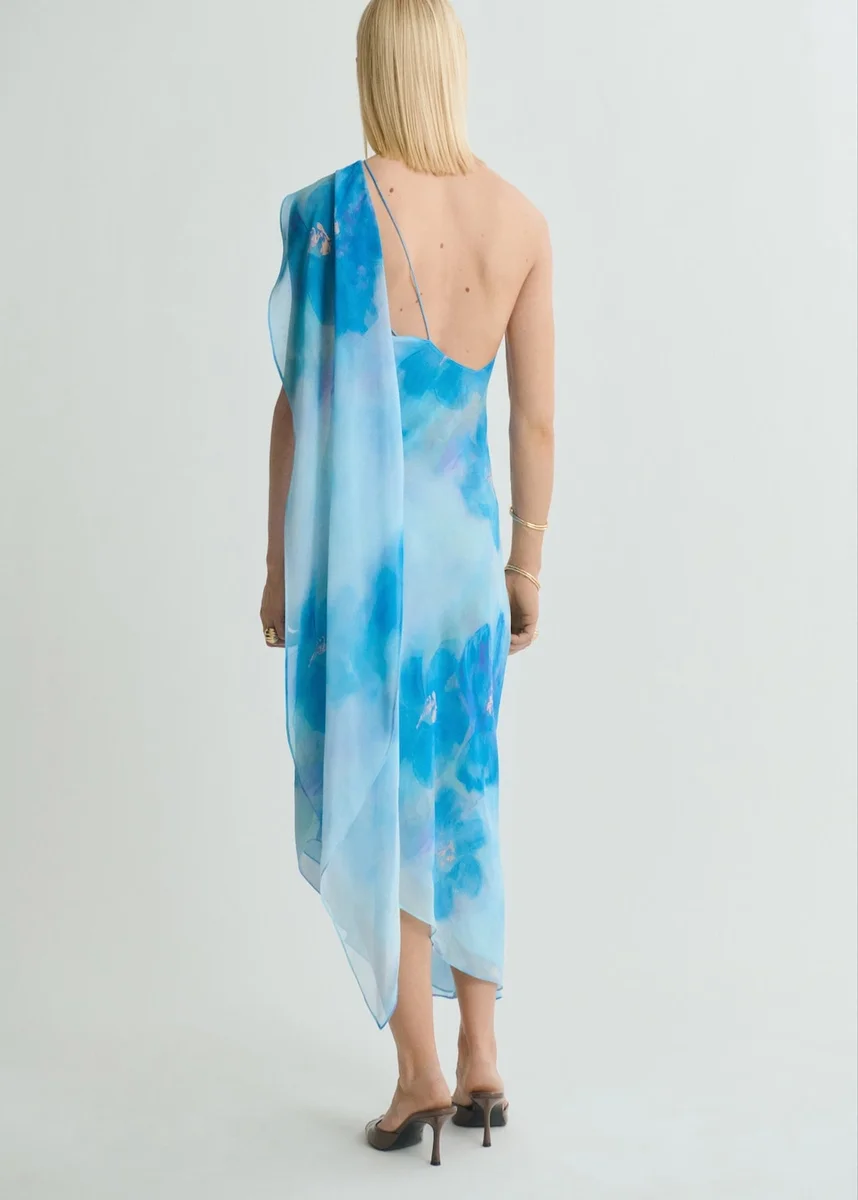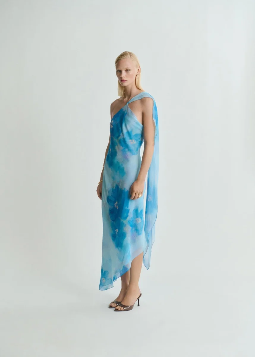 Midi střih. Asymetrický střih. Květinový potisk. Asymetrický výstřih. Bez rukávů. Otevřená záda. Boční zapínání na zip. Exkluzivně online