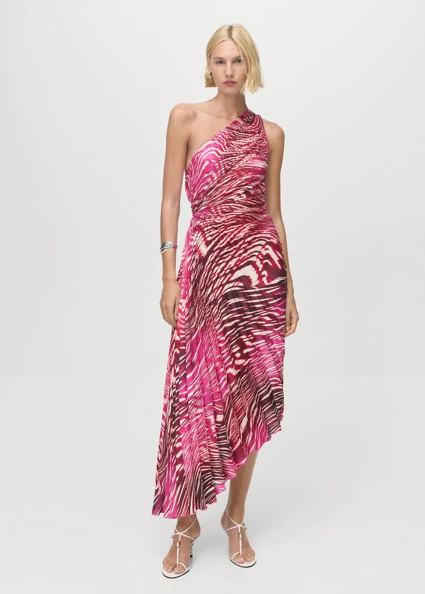 Plisovaná látka. Dlouhý střih. Střih do A. Potisk. Asymetrický výstřih. Široké ramínka. Otevřený detail. Asymetrický lem. Boční zapínání na zip. Vnitřní podšívka. Tento oděv je součástí naší kolekce pro speciální příležitosti, která je navržena tak, abyste byla dokonalým hostem na jakékoli párty, svatbě nebo slavnosti. Black Friday