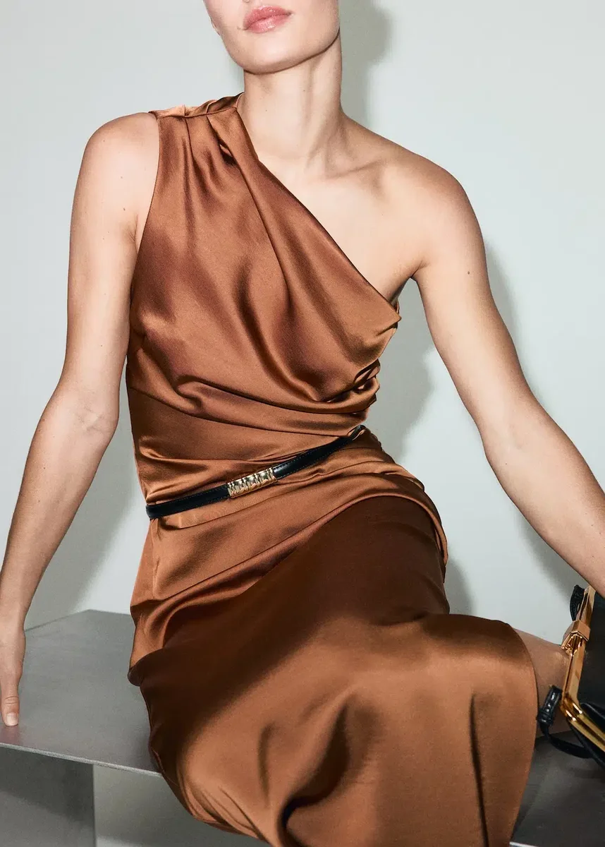 Saténová vazba. Midi střih. Přiléhavý střih. Asymetrický výstřih. Bez rukávů. Boční volány. Boční rozparek na spodním lemu. Boční zapínání na zip. Tento model je součástí naší kolekce pro večírky a slavnostní příležitosti, která vám pomůže vyniknout při zvláštních příležitostech.