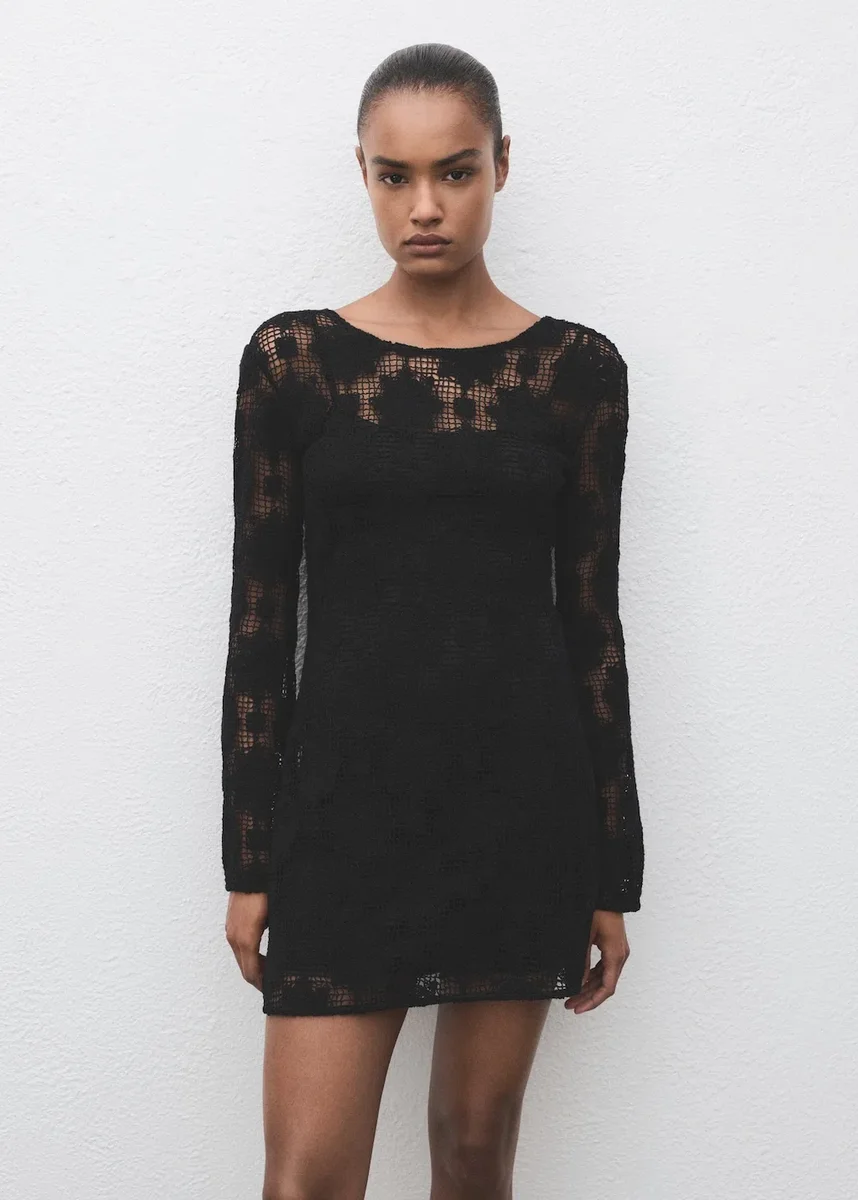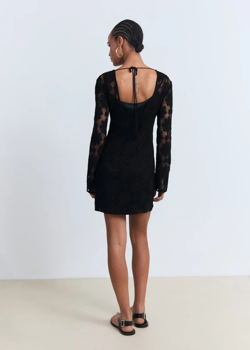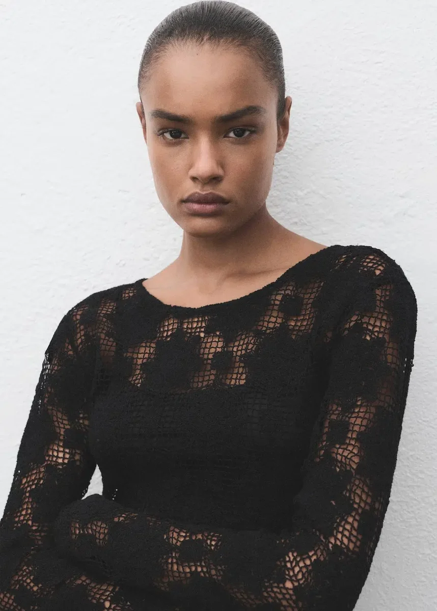 Háčkovaná látka. Krátký střih. Kulatý výstřih. Dlouhé rozšiřující se rukávy. Otevřená záda. Vázání na zadní straně. Vnitřní podšívka. Tento oděv je součástí naší kolekce pro volný čas, která je navržena tak, aby vás stylově doprovázela ve vašem každodenním životě.