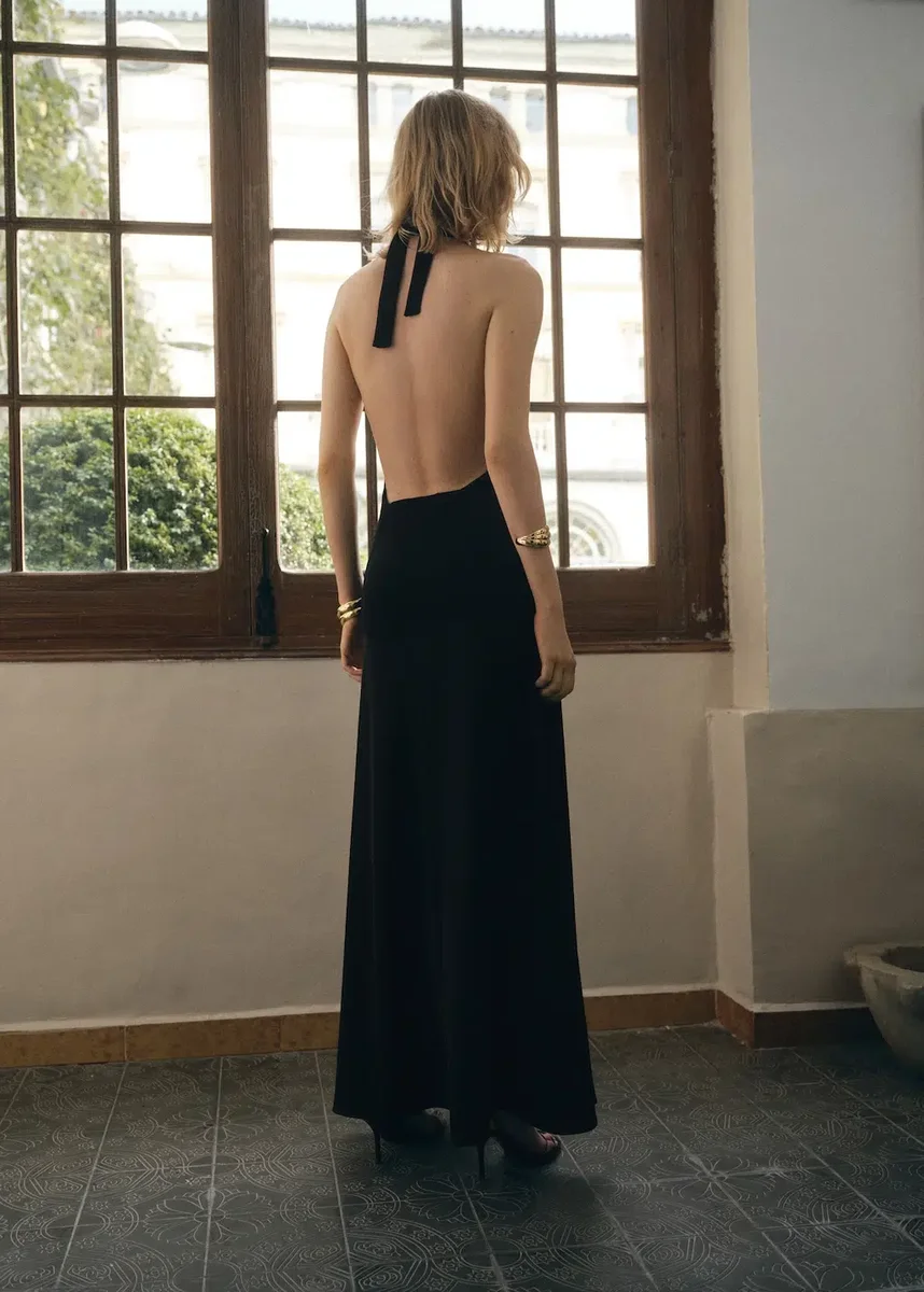 Kombinovaná tkanina. Dlouhý střih. Střih do A. Halter výstřih. Výstřih do V. Bez rukávů. Otevřená záda. Uzavírání na uzel na krku. Exkluzivně online. Tento oděv je součástí naší kolekce pro speciální příležitosti, která je navržena tak, abyste byla dokonalou hostkou na jakékoli párty, svatbě nebo slavnostní události.