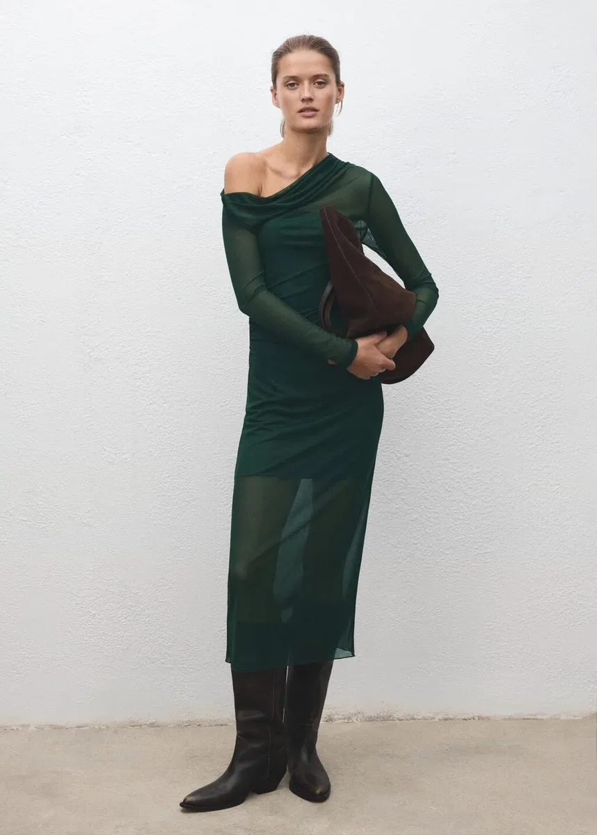 Poloprůsvitná tkanina. Midi střih. Přiléhavý střih. Asymetrický výstřih. Dlouhé rukávy. Bez zapínání. Vnitřní podšívka. Tento oděv je součástí naší kolekce pro večírky a společenské události, která byla navržena tak, aby podtrhla váš vzhled při zvláštních příležitostech.