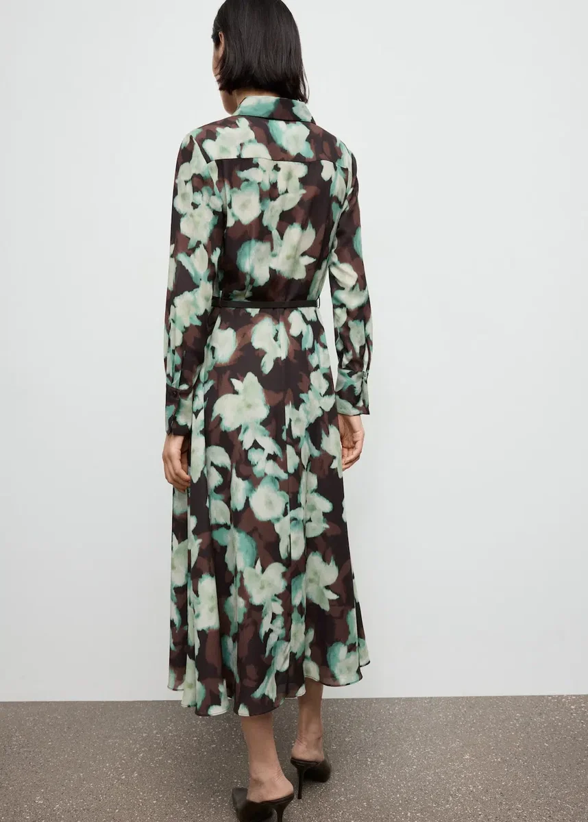 Střih midi. Střih do A. Potisk. Košilový límec. Dlouhé rukávy s manžetami na knoflíky. Zapínání na pásek s přezkou. Zapínání na knoflíky vpředu. Vnitřní podšívka.