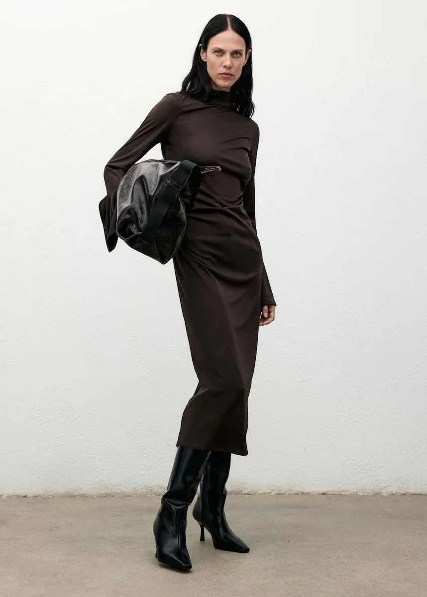 Midi střih. Přiléhavý střih. Stojací límec. Dlouhé rozšiřující se rukávy. Boční volány. Rozparek na zadním lemu. Zapínání na zadní zip. Tento oděv je součástí naší ležérní kolekce, která je navržena tak, aby vás stylově doprovázela ve vašem každodenním životě.
