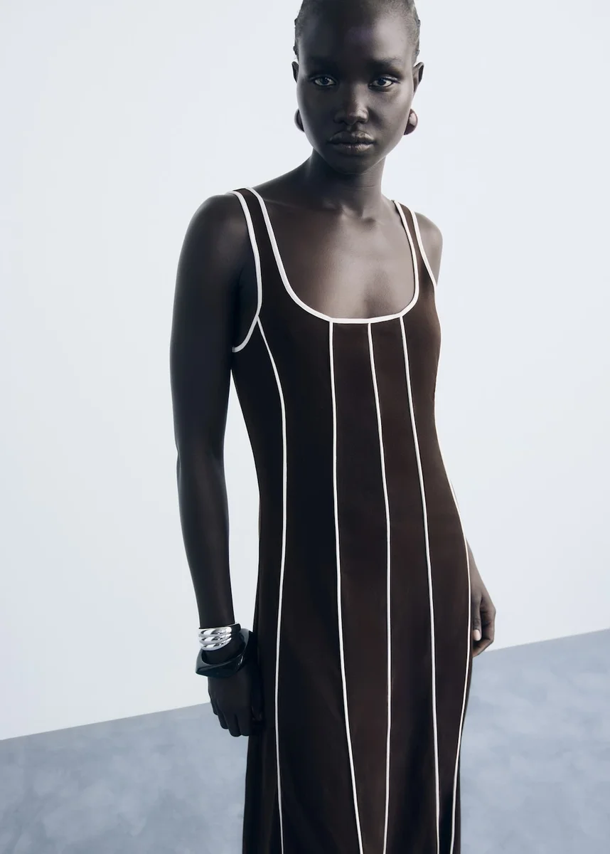 Bavlněná tkanina. Midi střih. Rovný střih. Hluboký výstřih. Bez rukávů. Široká ramínka. Pružný pruhovaný vzor. Bez zapínání. Tento oděv je součástí naší kolekce pro volný čas, která je navržena tak, aby vás stylově doprovázela ve vašem každodenním životě.