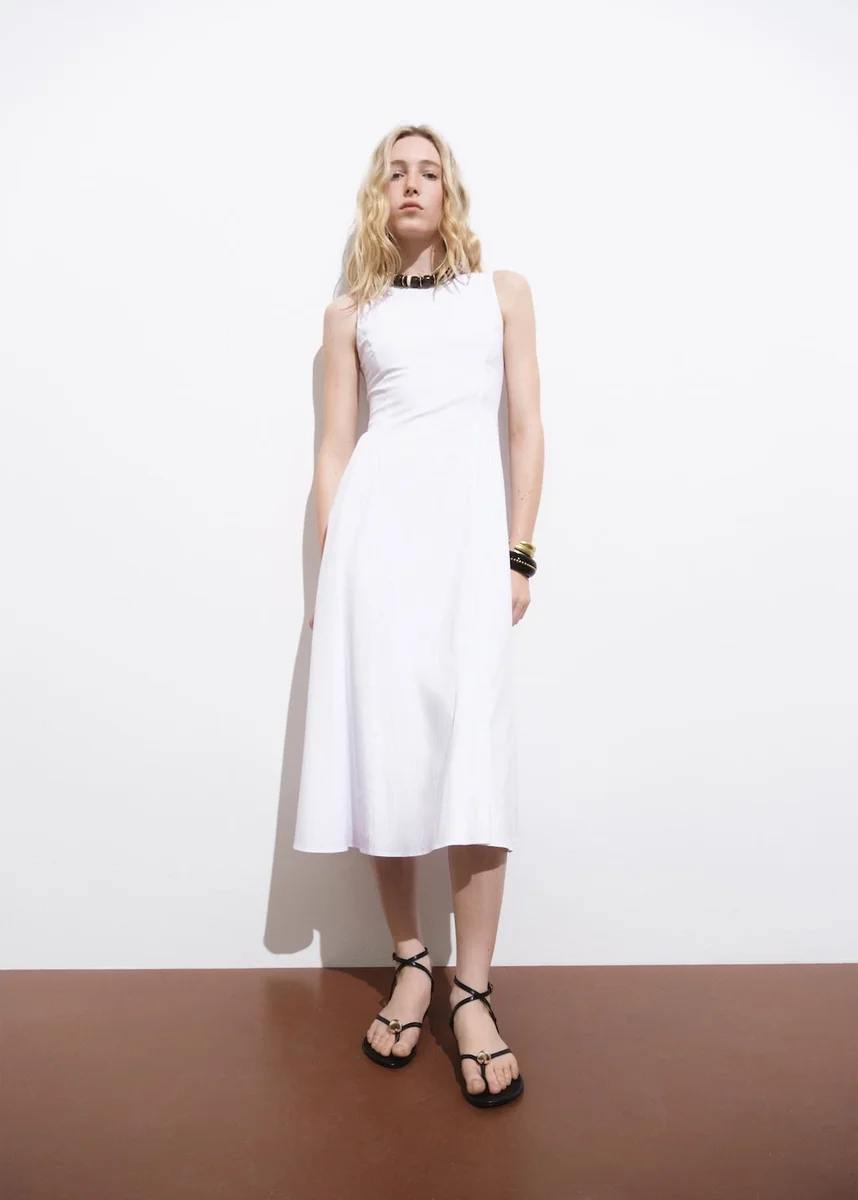 Midi střih. Střih do A. Kulatý výstřih. Bez rukávů. Široké ramínka. Zapínání na zip vzadu. Podšívka 100 % bavlna